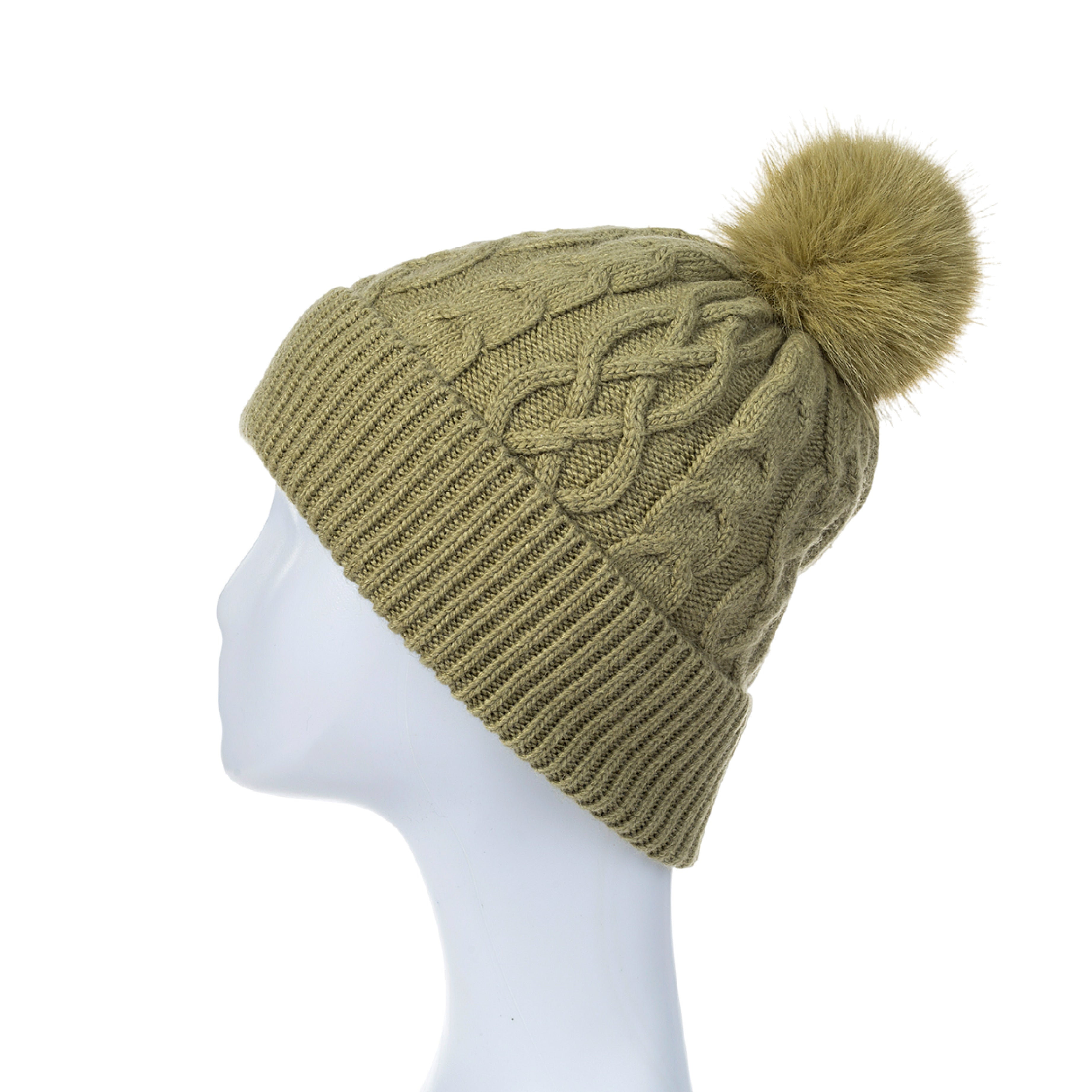 Women's Cable Knit Hat with Faux Fur Pom Pom | Artichoke Green