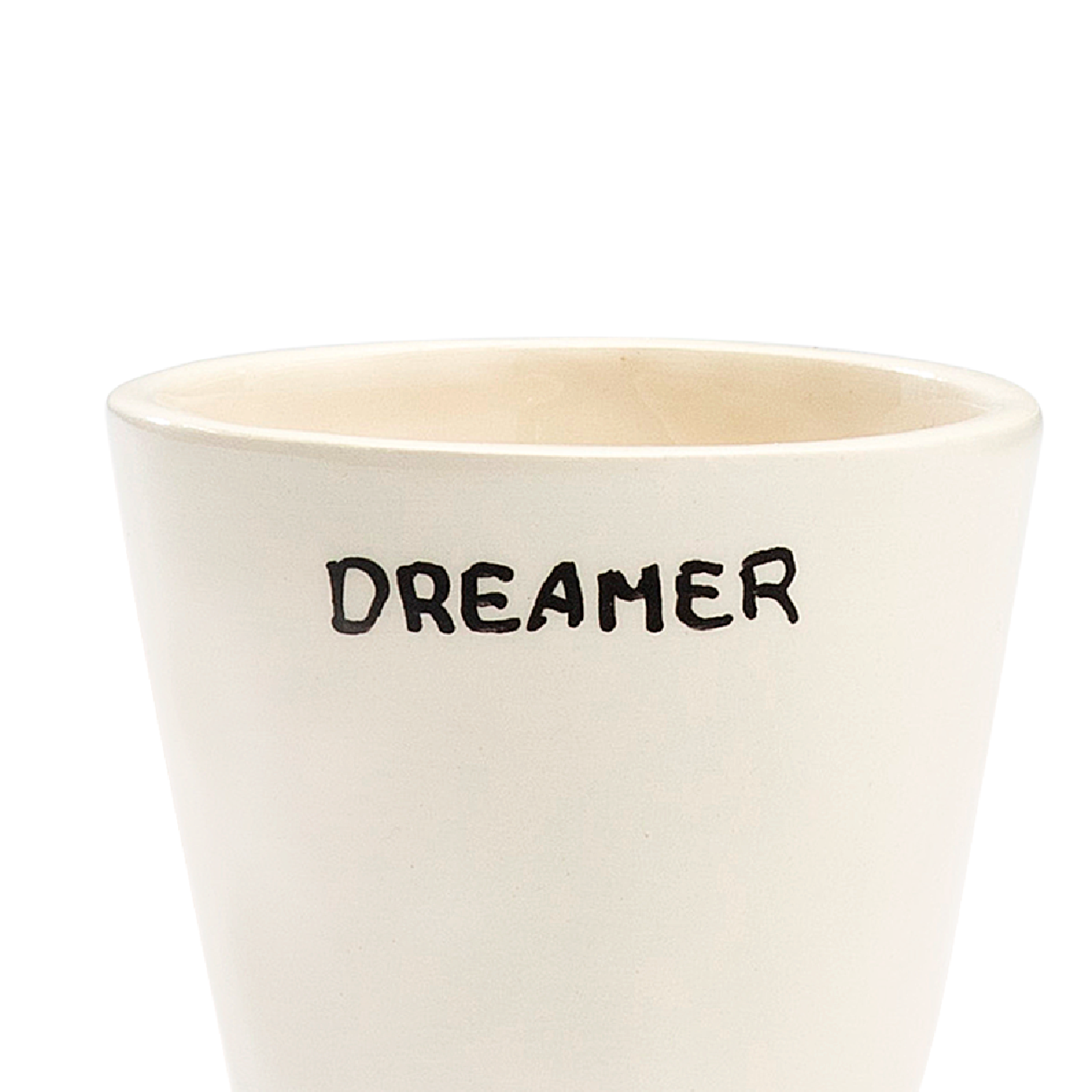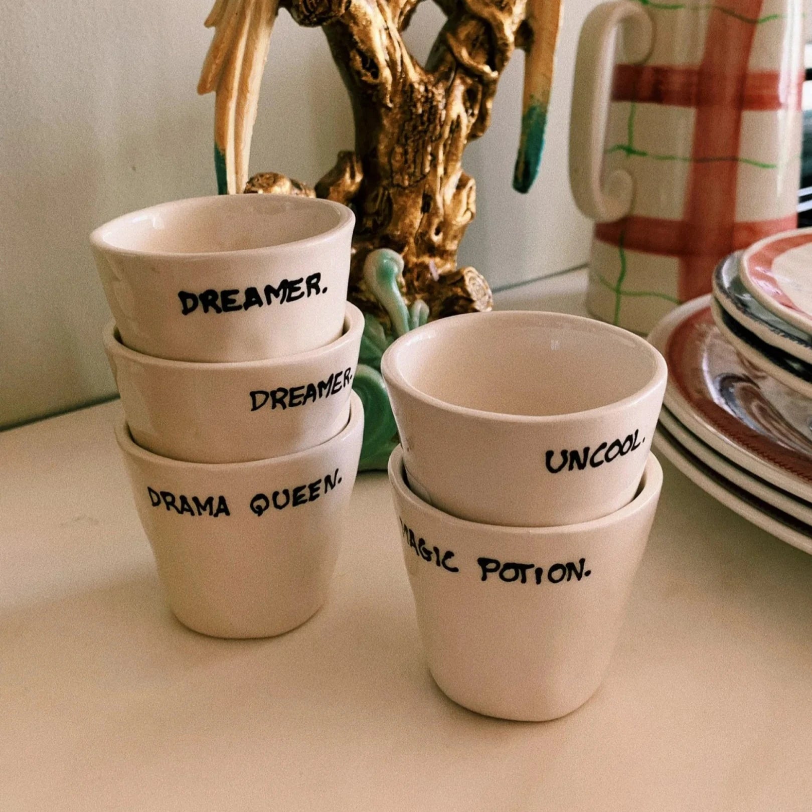 Anna + Nina’s ceramic espresso cup is worth waking for. Coloured white, its petite body is organically shaped and boasts quirky imperfections that play curiously in the light. Complete with a hand painted sentiment coloured black on its front - Anna + Nina’s espresso cup is the go-to for dreamers.