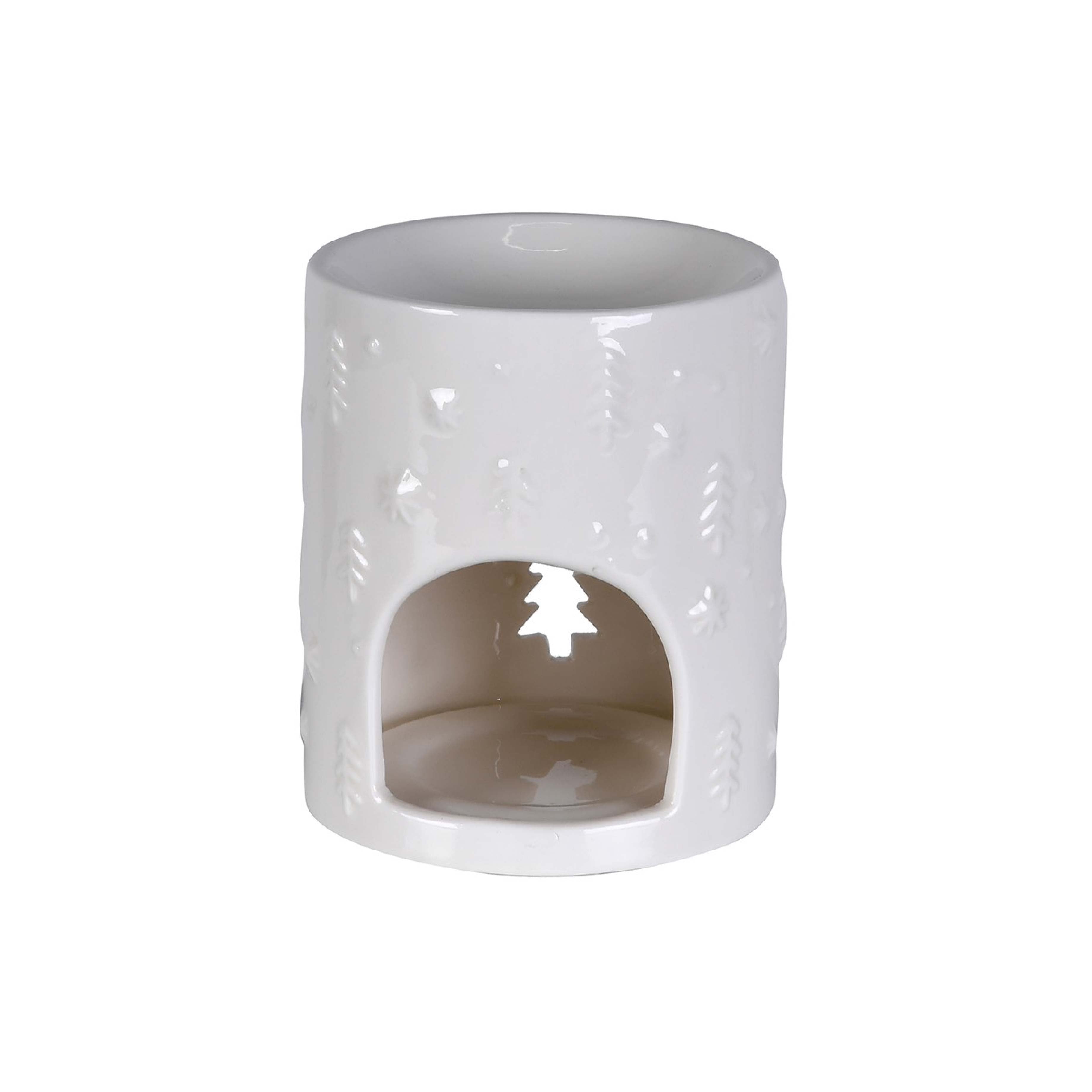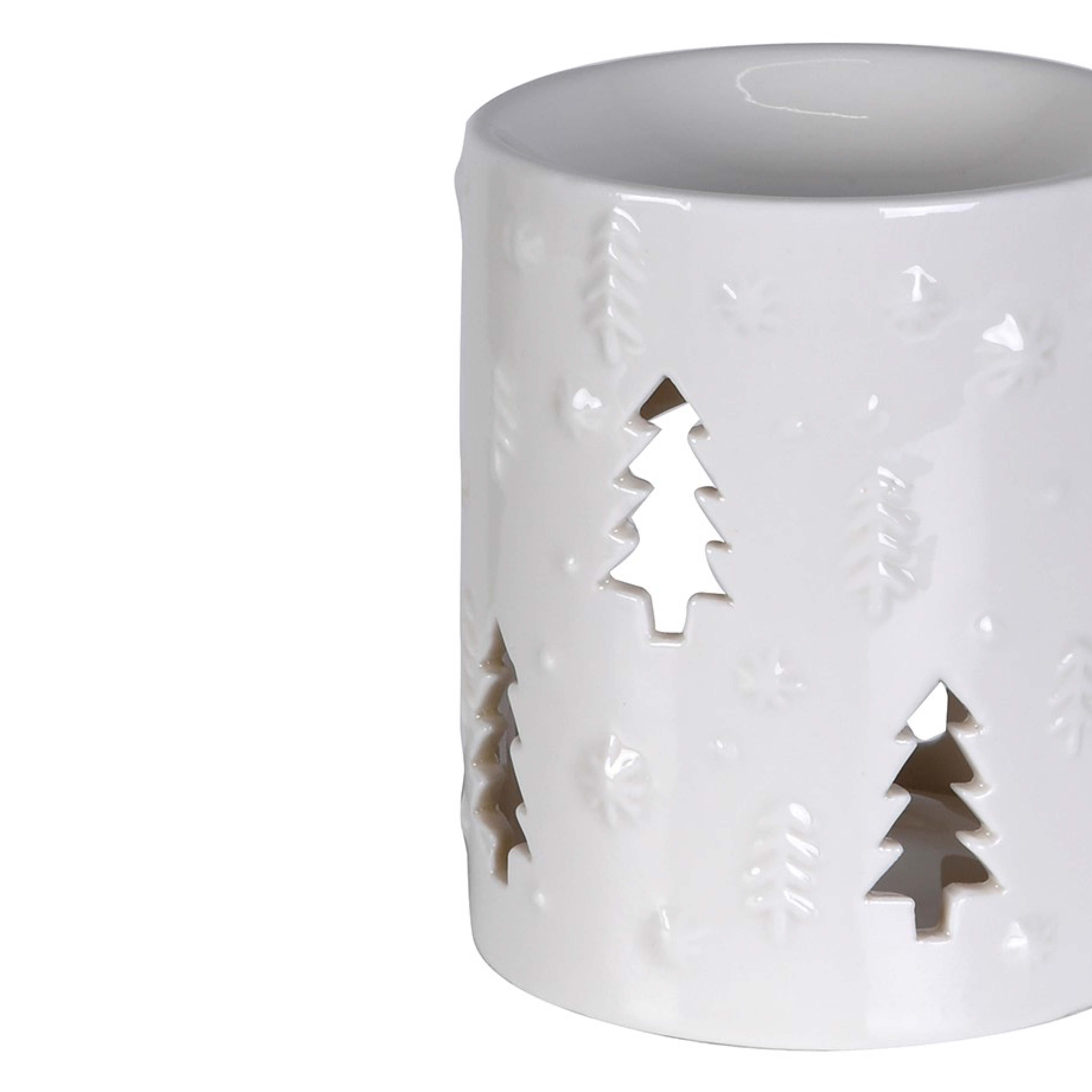 Our wax melter adds a contemporary twist to tradition. Crafted from ceramic coloured white, its cylindrical silhouette features carefully cut-out Christmas trees - simply add tealight and wax melt, and marvel as each pine twinkles by flame.