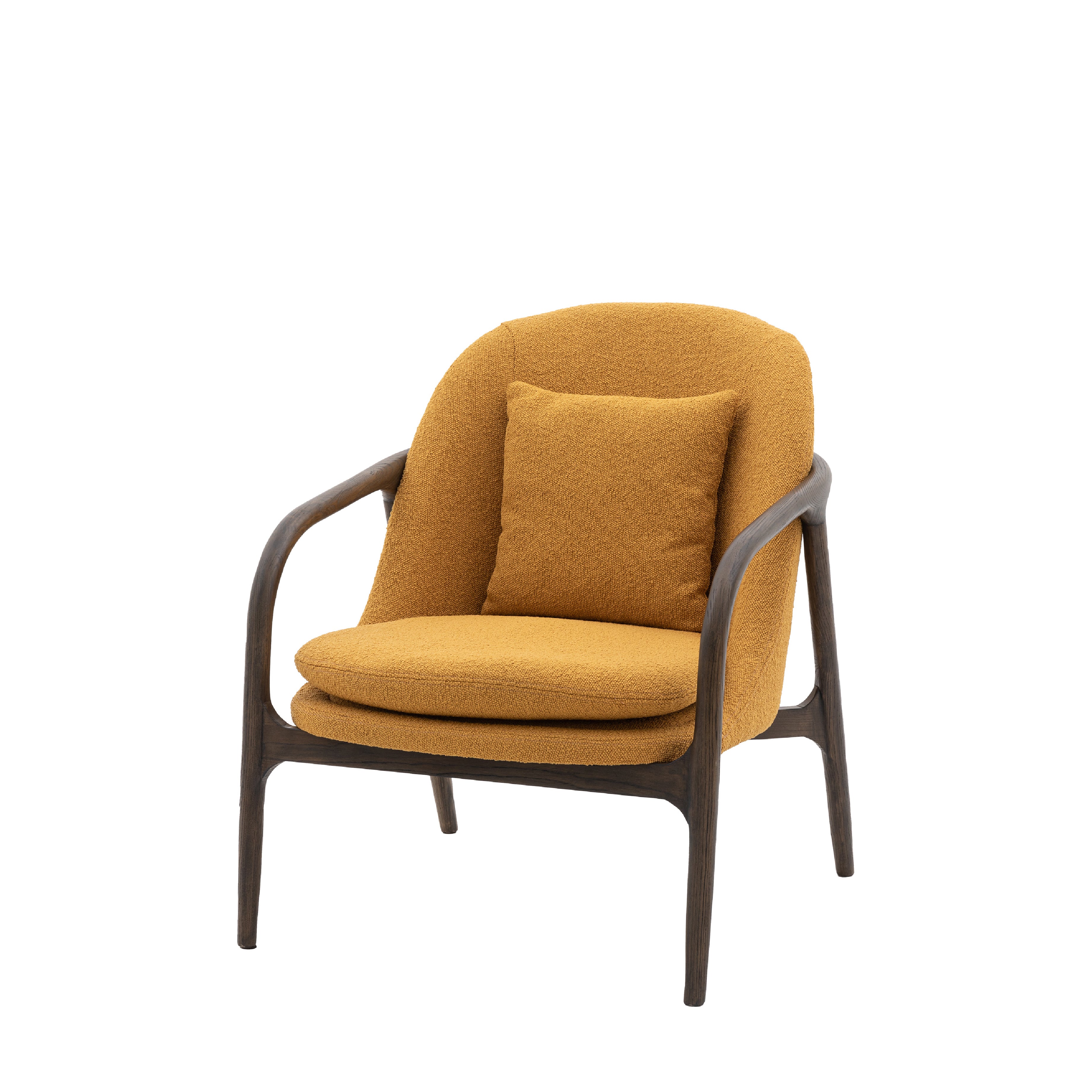 Stylish and quirky Mid-Century inspired chair with hand curved sleek lines. The dark wood frame curves around the seat creating soft and sleek lines that are perfect for both modern and vintage inspired interiors. Upholstered in retro feeling yellow ochre fabric with a padded seat cushion and comfortable back cushion.
