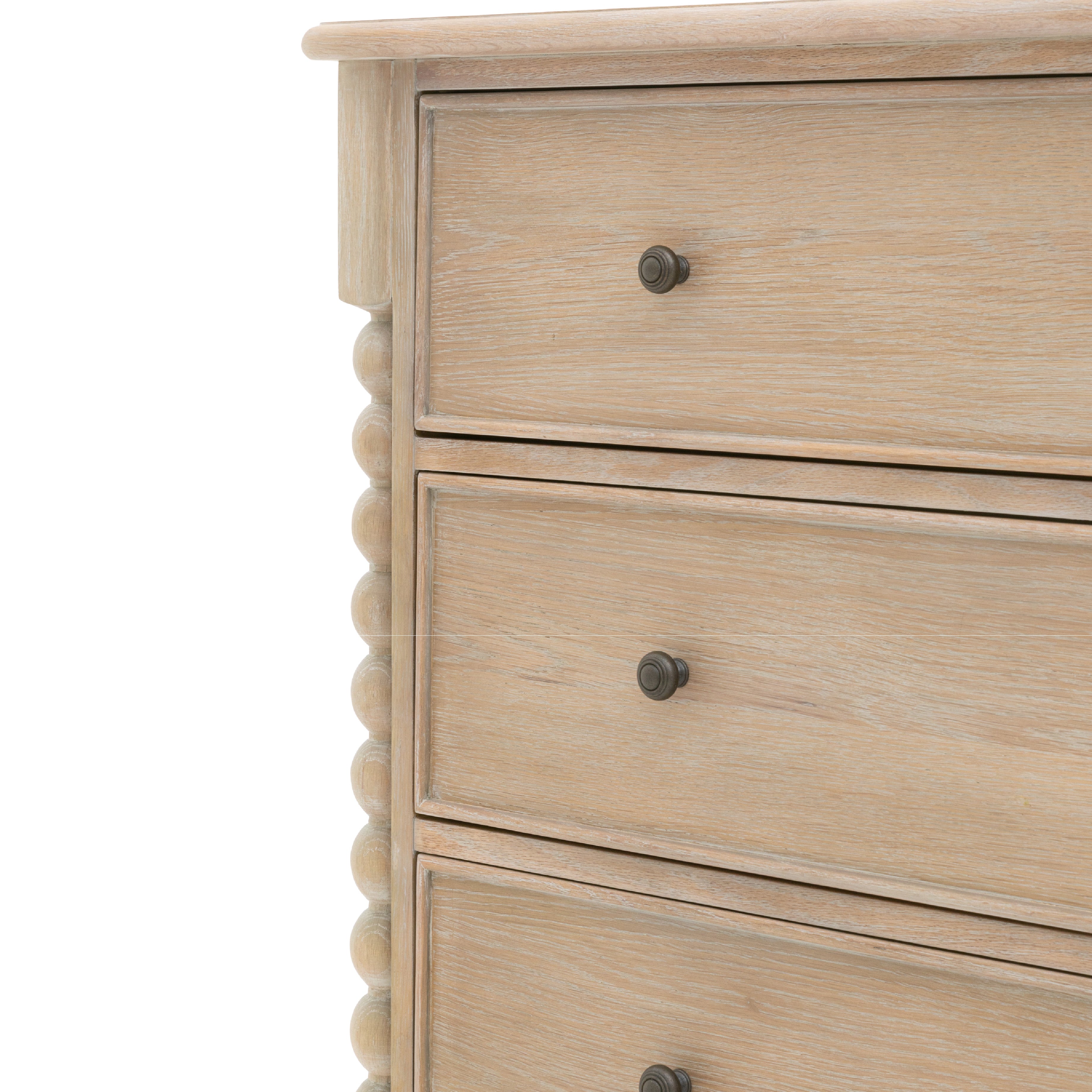 This 3 drawer chest provides a refined storage option with its timeless design and expert craftsmanship. Featuring hand-turned bobbin detailing and a lime-wash oak finish, this chest blends durability and sophistication. The three spacious drawers are ideal for organizing and storing household essentials with ease.