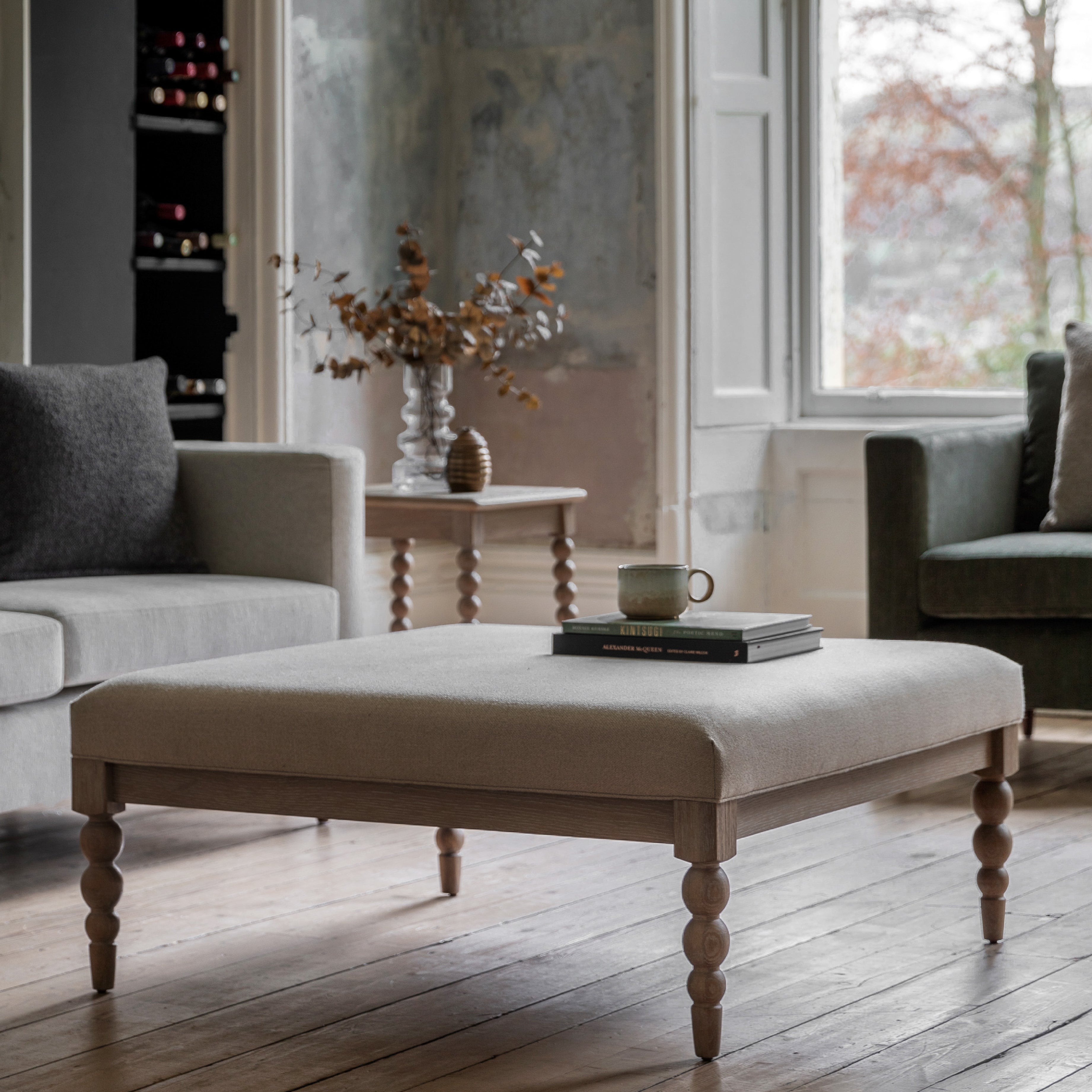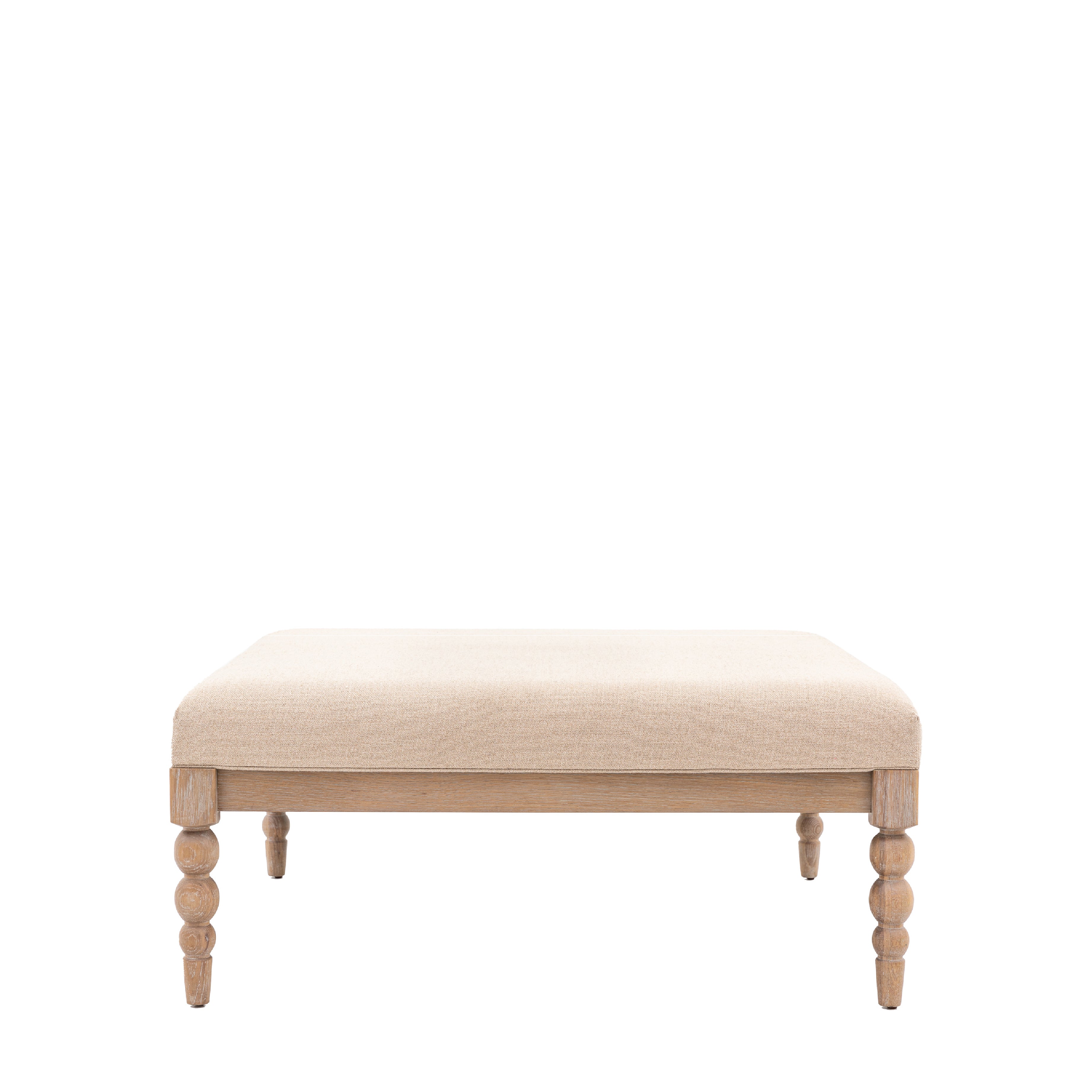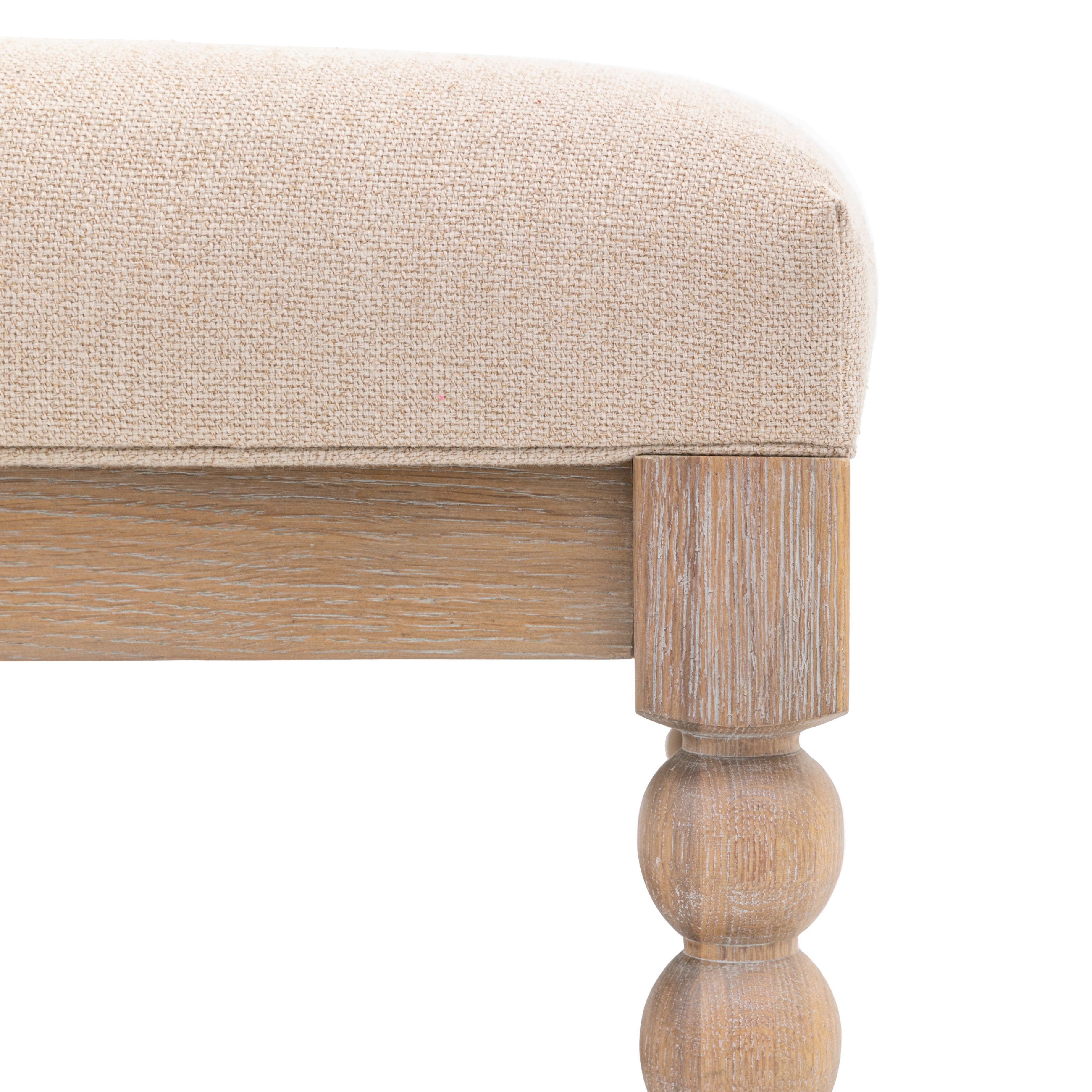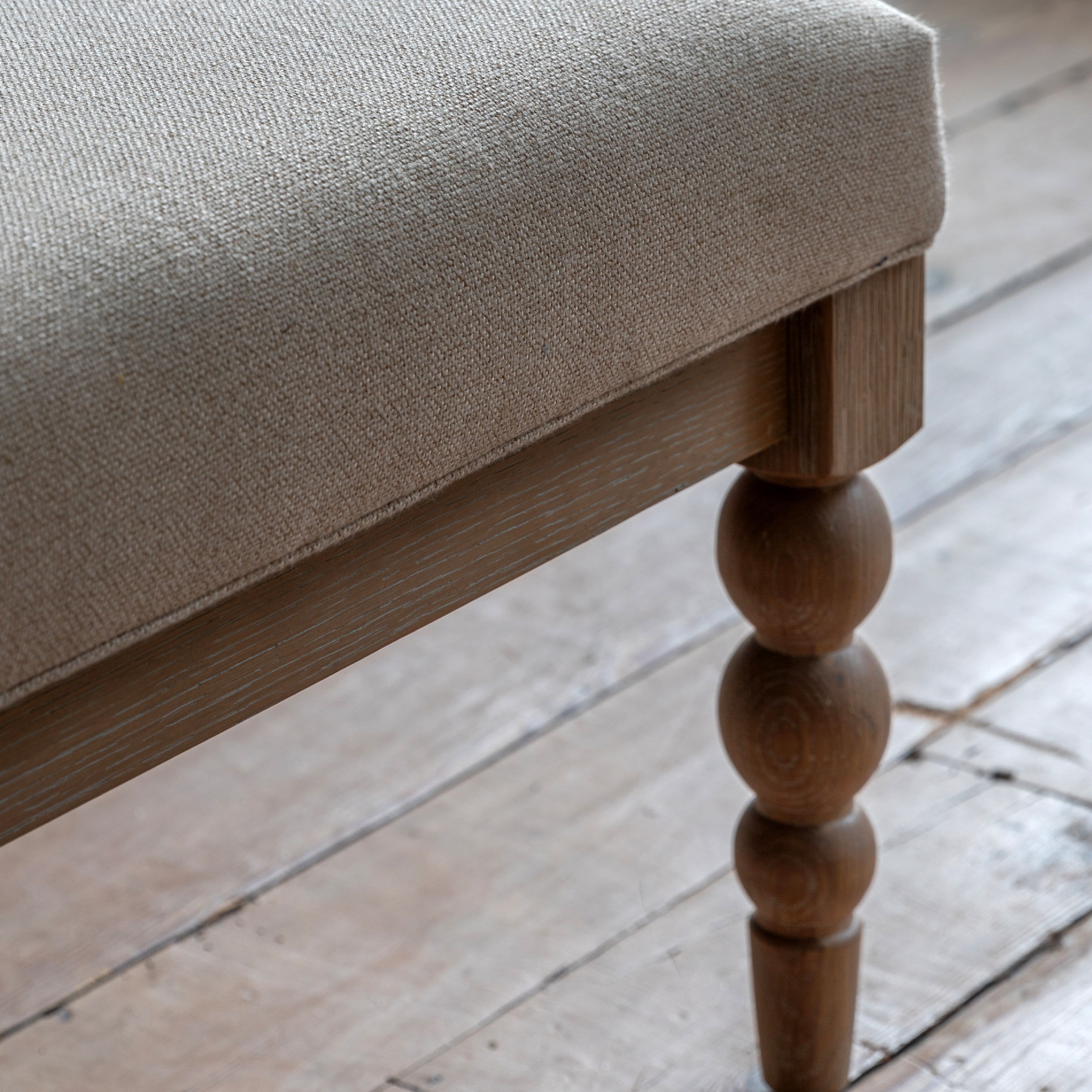 The eye-catching legs on this beautiful coffee table feature hand-crafted bobbin detail which is created by turning the wood on a lathe, a task carried out by the finest craftsmen. The table is made from oak with a very subtle lime wash tone to the finish which is soft and mellow, paired with biscuit coloured fabric for the upholstered seat.