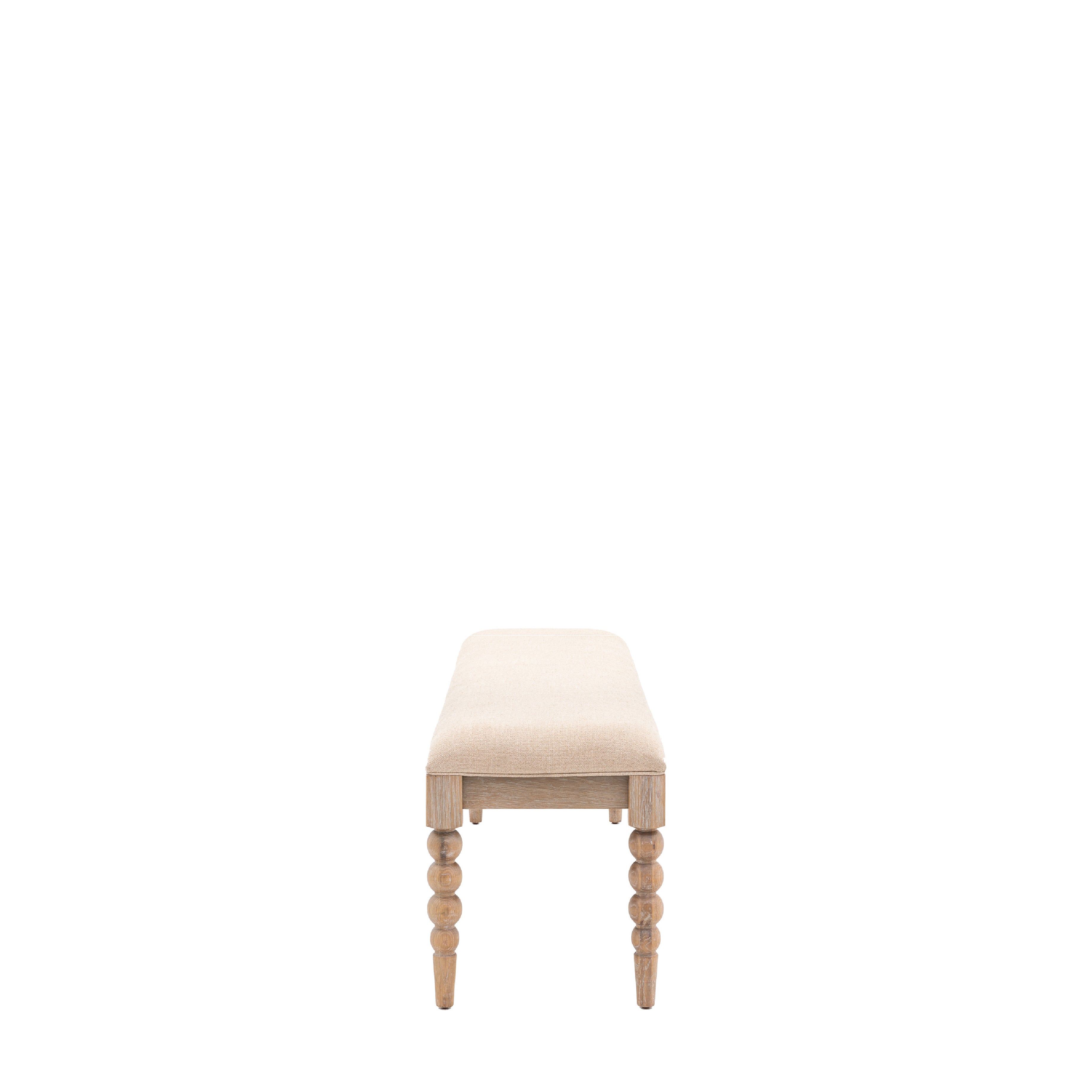 The eye-catching legs on this beautiful dining bench feature hand-crafted bobbin detail which is created by turning the wood on a lathe, a task carried out by the finest craftsmen. The bench is made from oak with a very subtle lime wash tone to the finish which is soft and mellow, paired with biscuit coloured fabric for the upholstered seat.