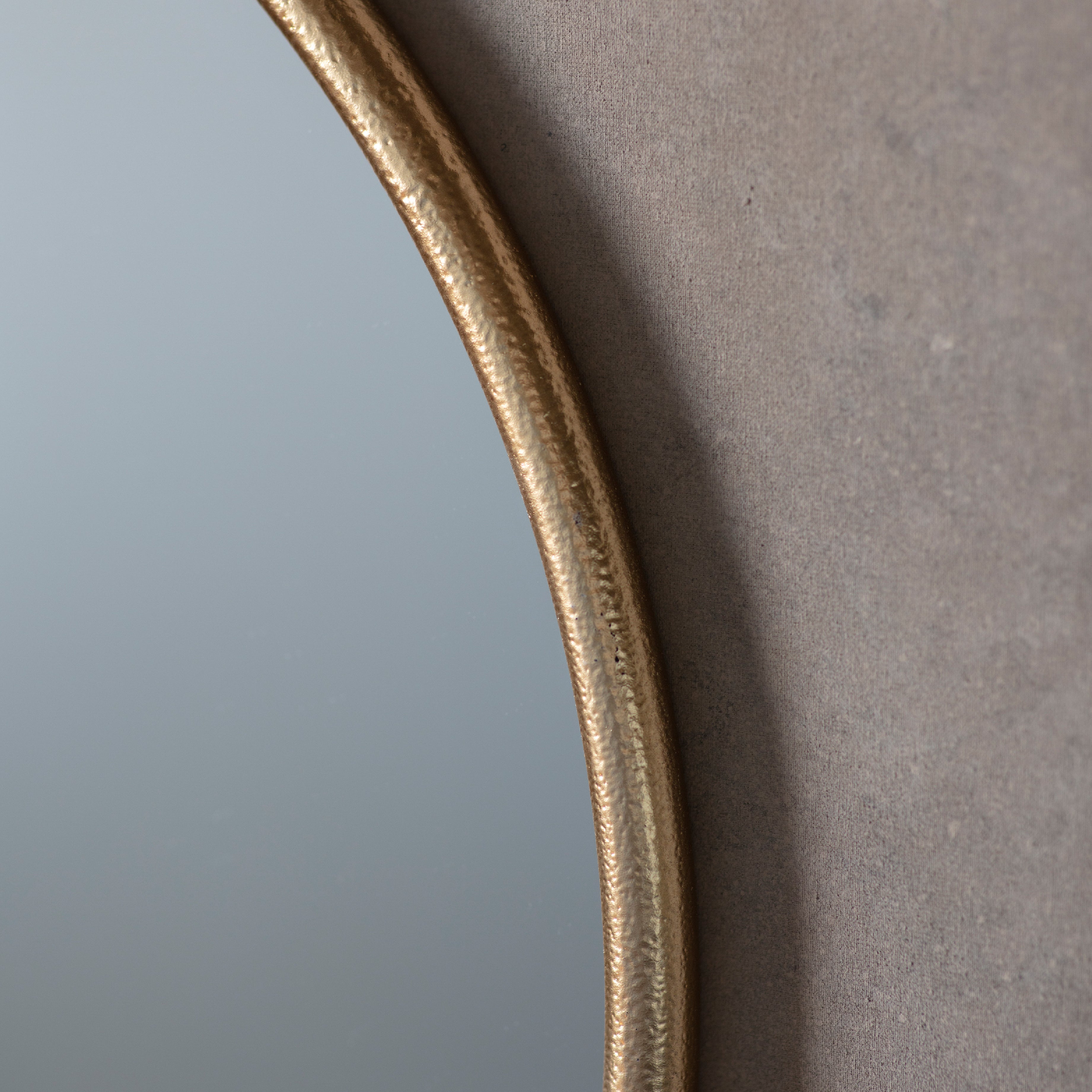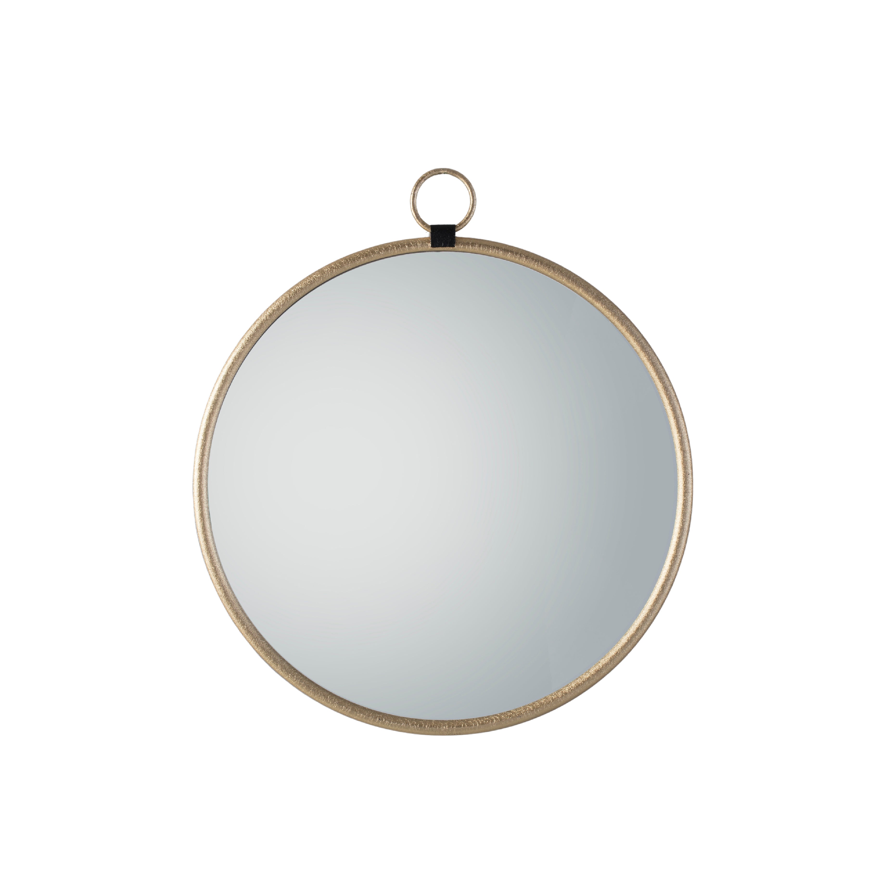Simple yet stylish mirror with an industrial feel, featuring a gold coloured metal surround and 'hanging' loop, joined to the main frame by contrasting black metal to add a subtle detail.
