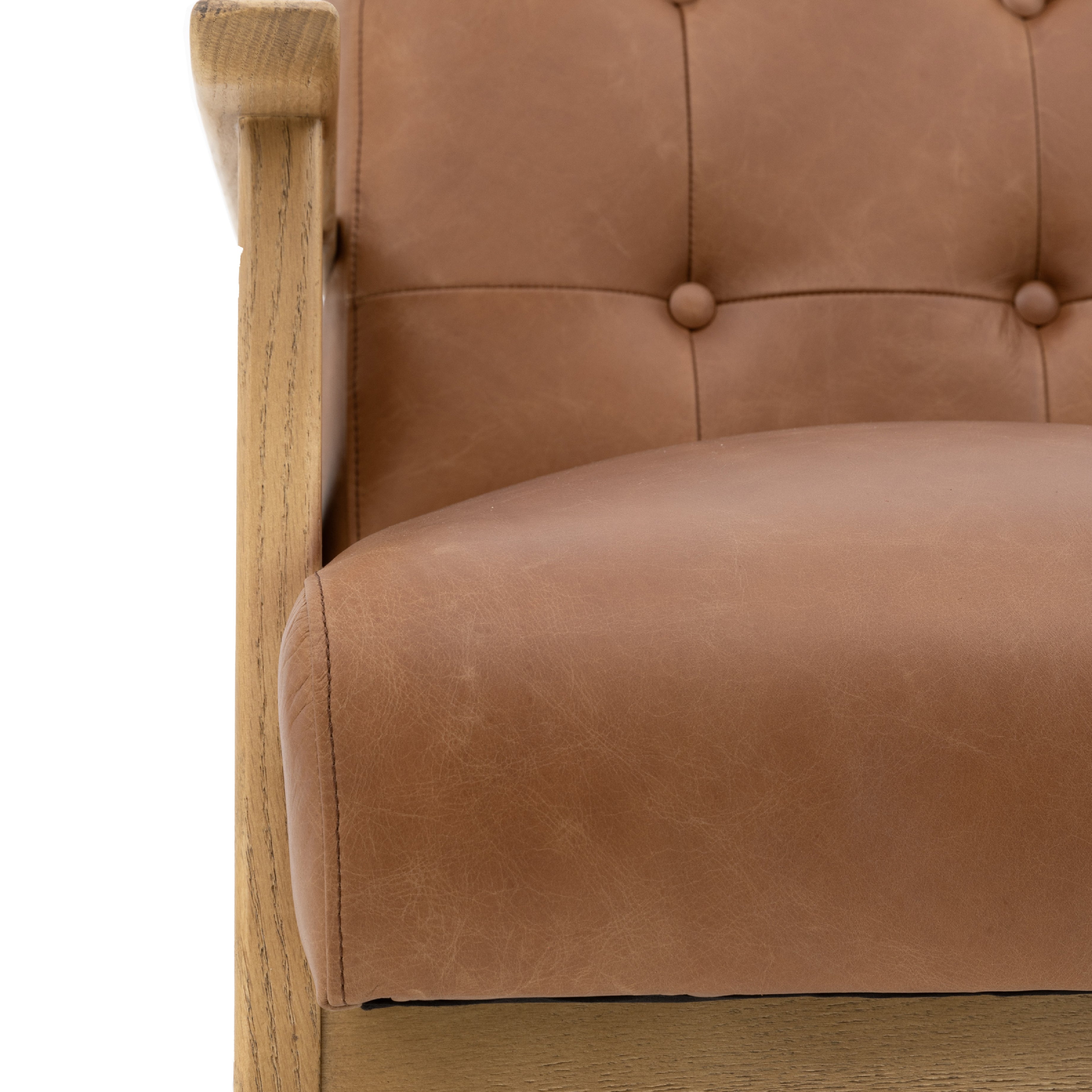 This exquisite chair features a sleek, minimalist scandi-inspired frame that emphasizes clean lines and understated elegance. The buttoned back adds a touch of sophistication and traditional craftsmanship, creating a striking contrast with the modern, streamlined design. The antique brown leather upholstery exudes warmth and character, while also providing a luxurious feel and durability.