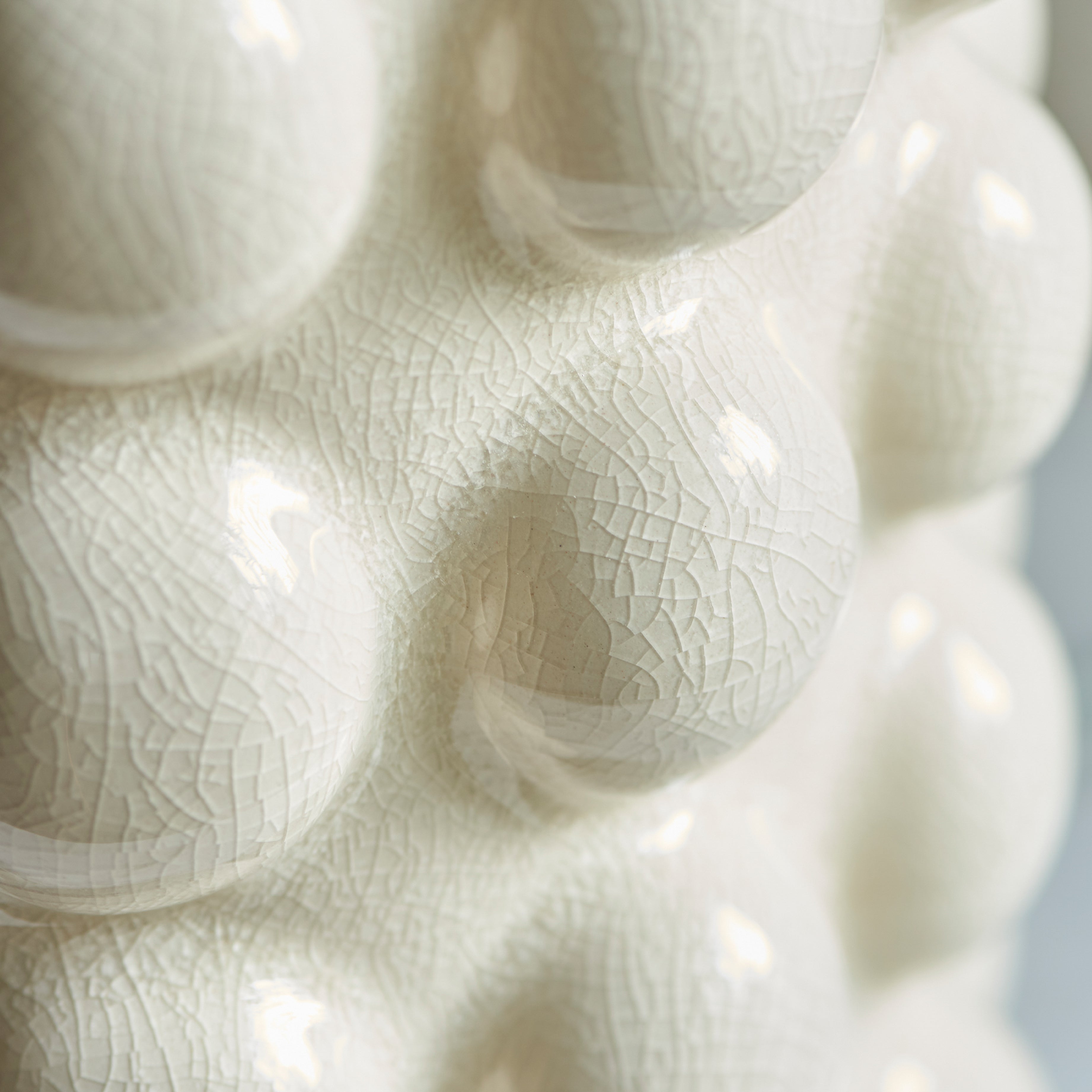 Gallery’s table lamp base defines the whimsical. Crafted from ceramic coloured white, its cylindrical silhouette boasts a curious bobble motif that plays curiously in the light. Topped with a high-polished brass lamp holder and complete with a chic crackle glaze finish - on or off, Gallery’s table lamp makes a statement.