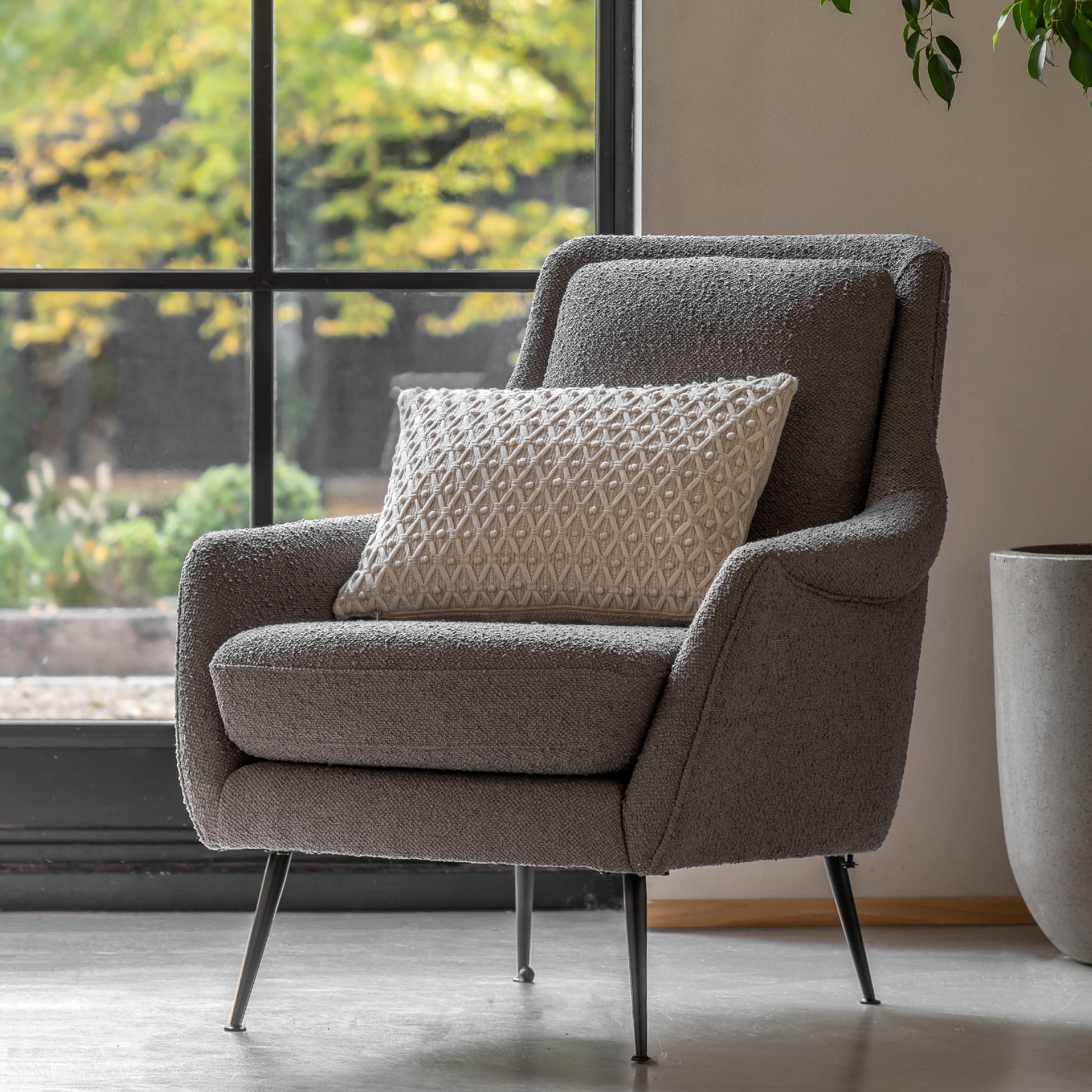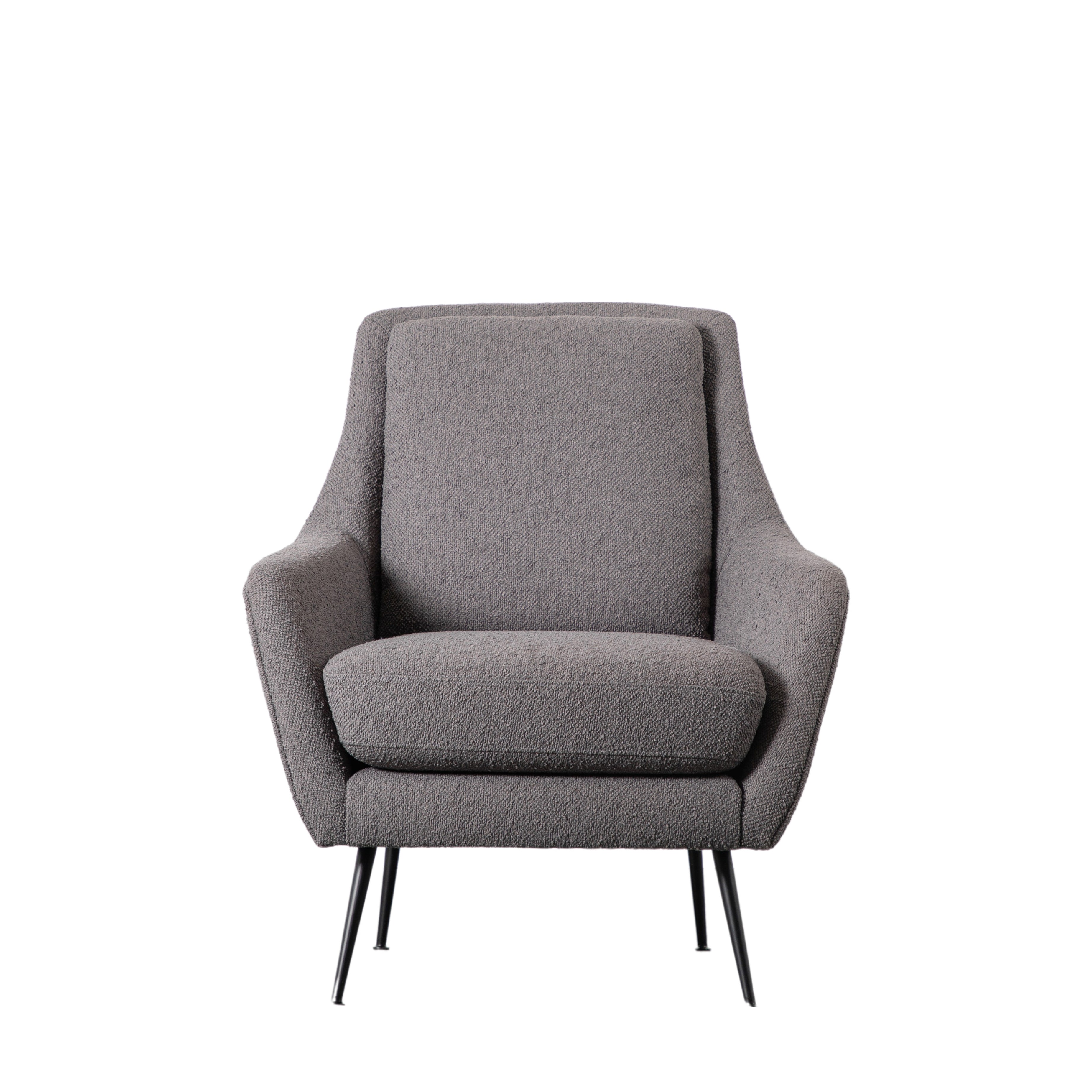 Grey linen armchair offering a retro feel, with a contemporary twist. The chair surround is fully upholstered with an upholstered fixed back cushion and loose seat cushion. Slim matt black metal legs complete the look.