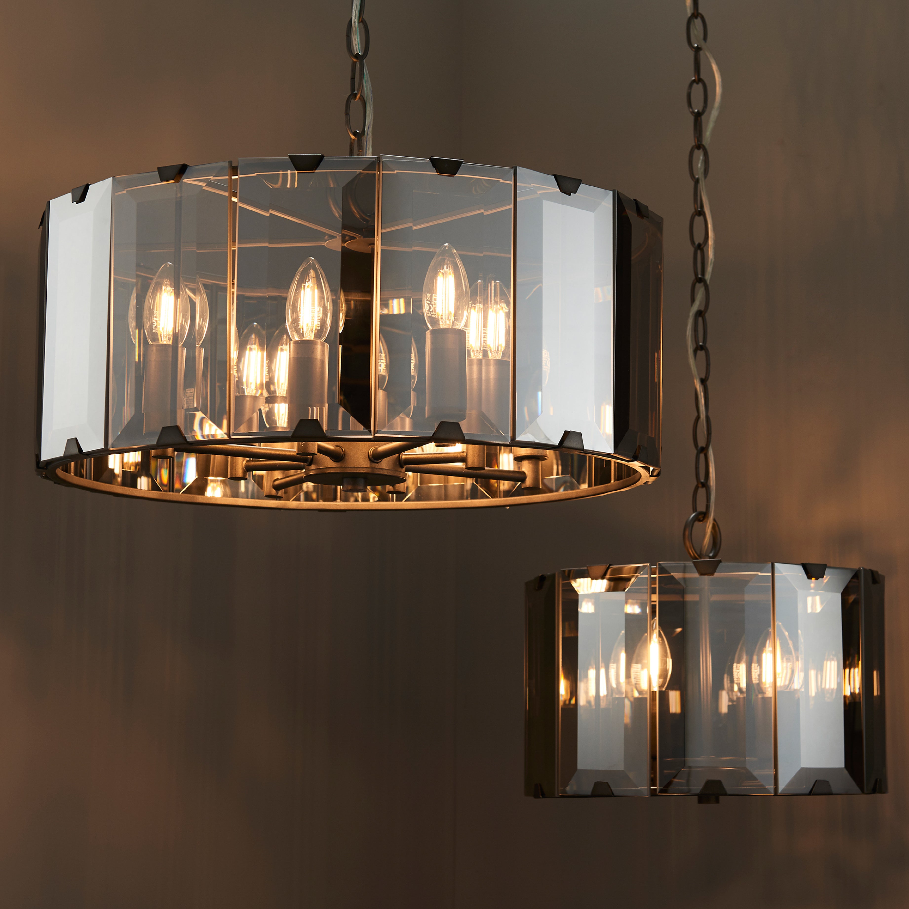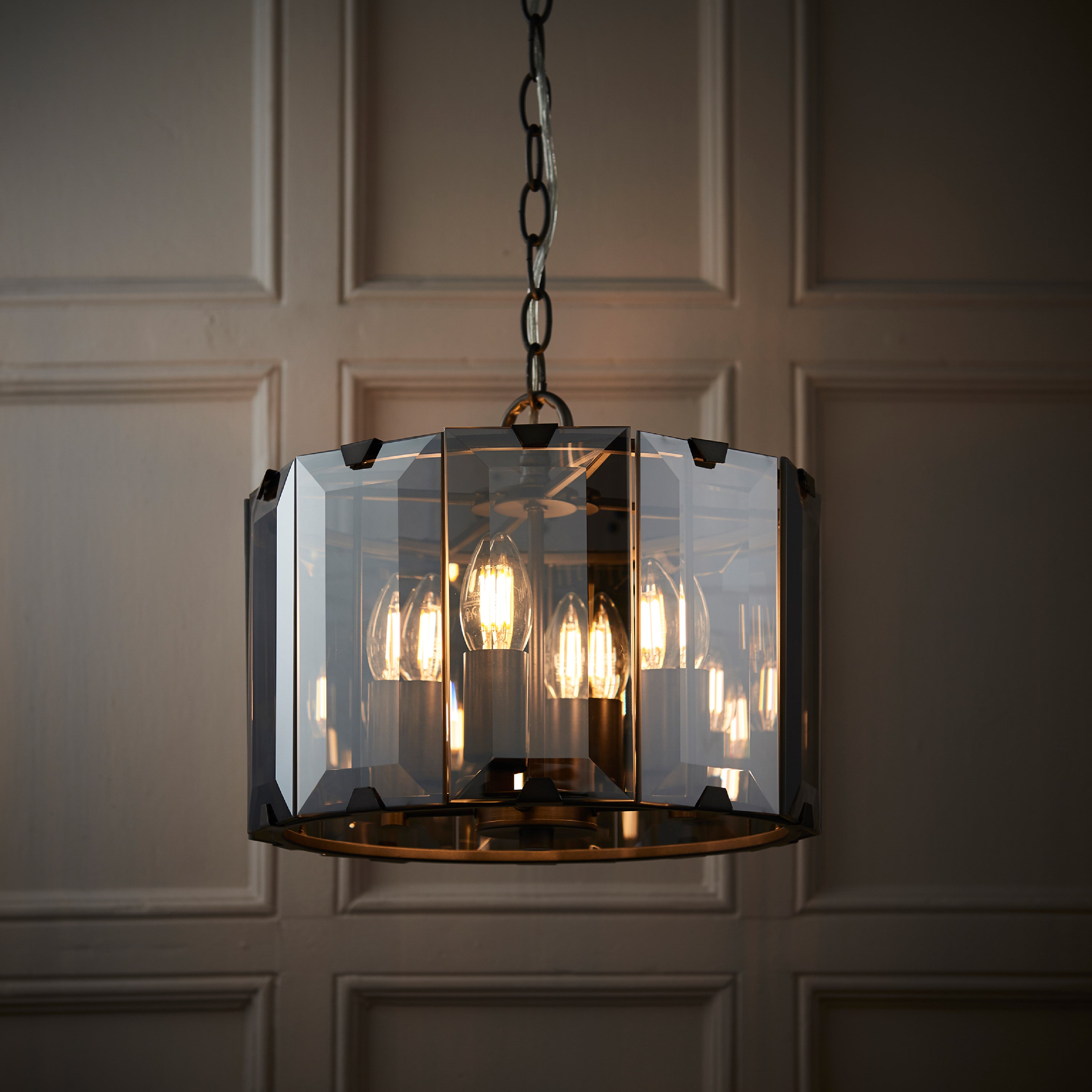 Gallery’s pendant light of the Clooney Collection is double-take worthy by design. Crafted from bevelled smoked glass panels coloured slate grey, it features a curious chain hanger that drops up to 122cm. Designed to fit four filament bulbs; on or off - marvel as each chic panel interacts with the light.