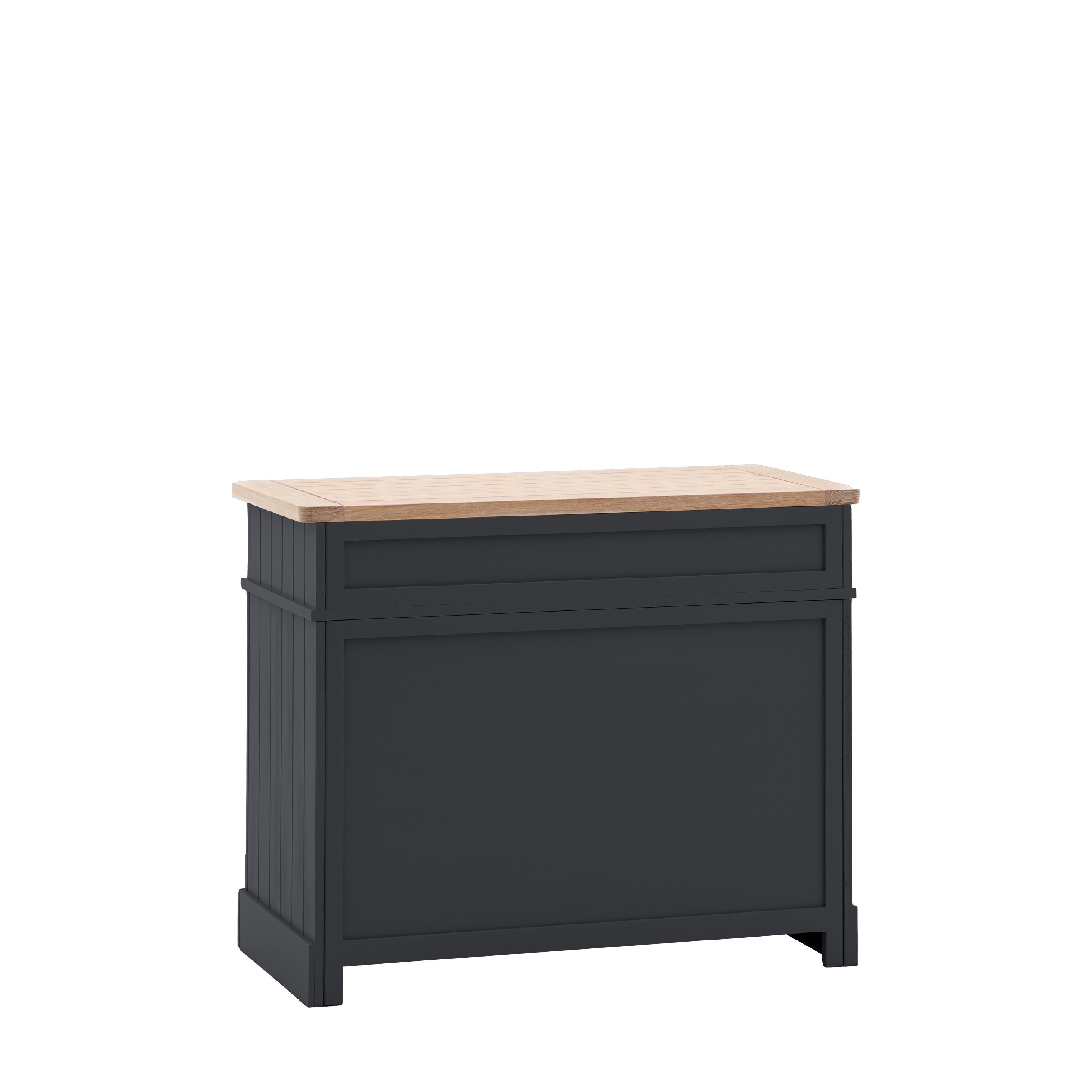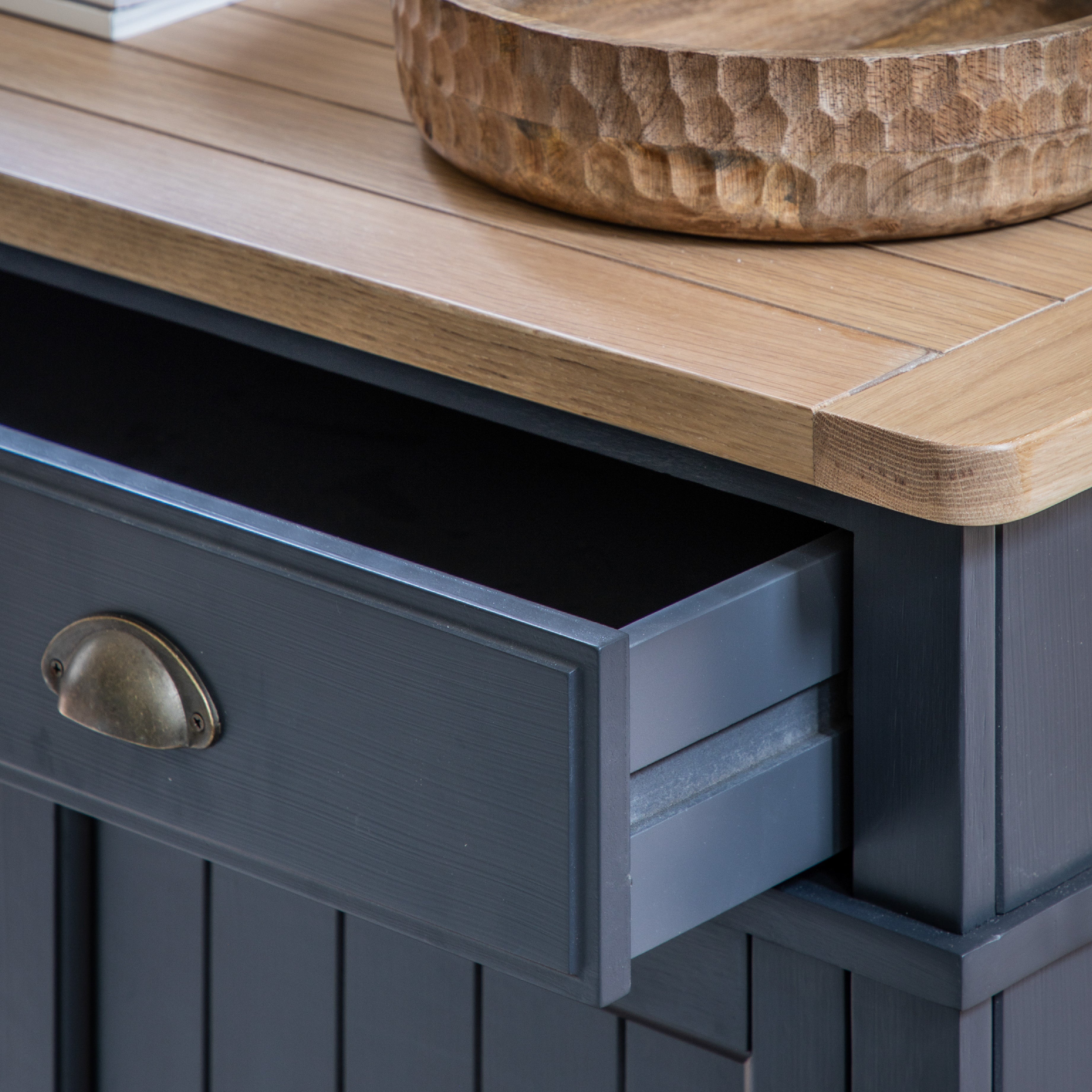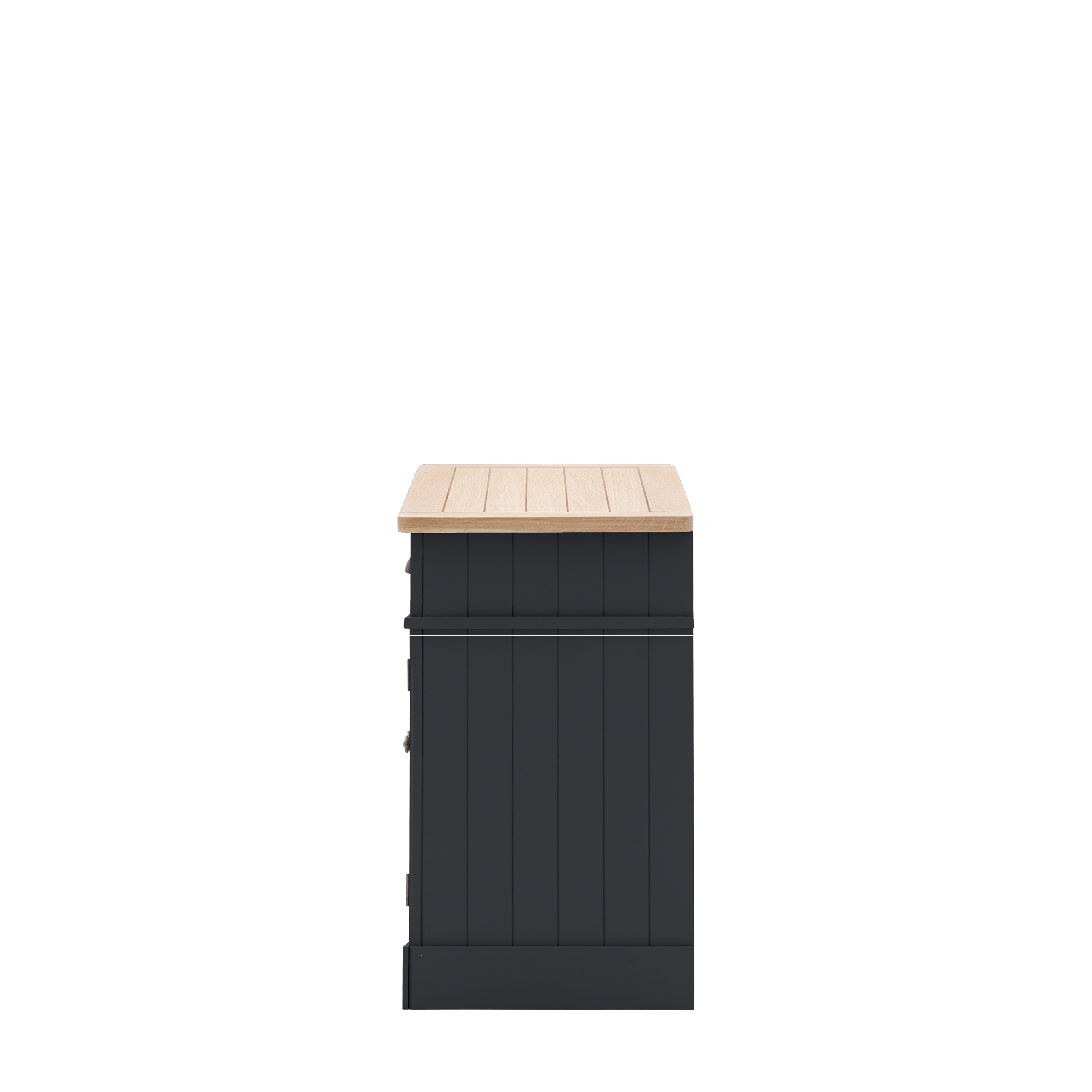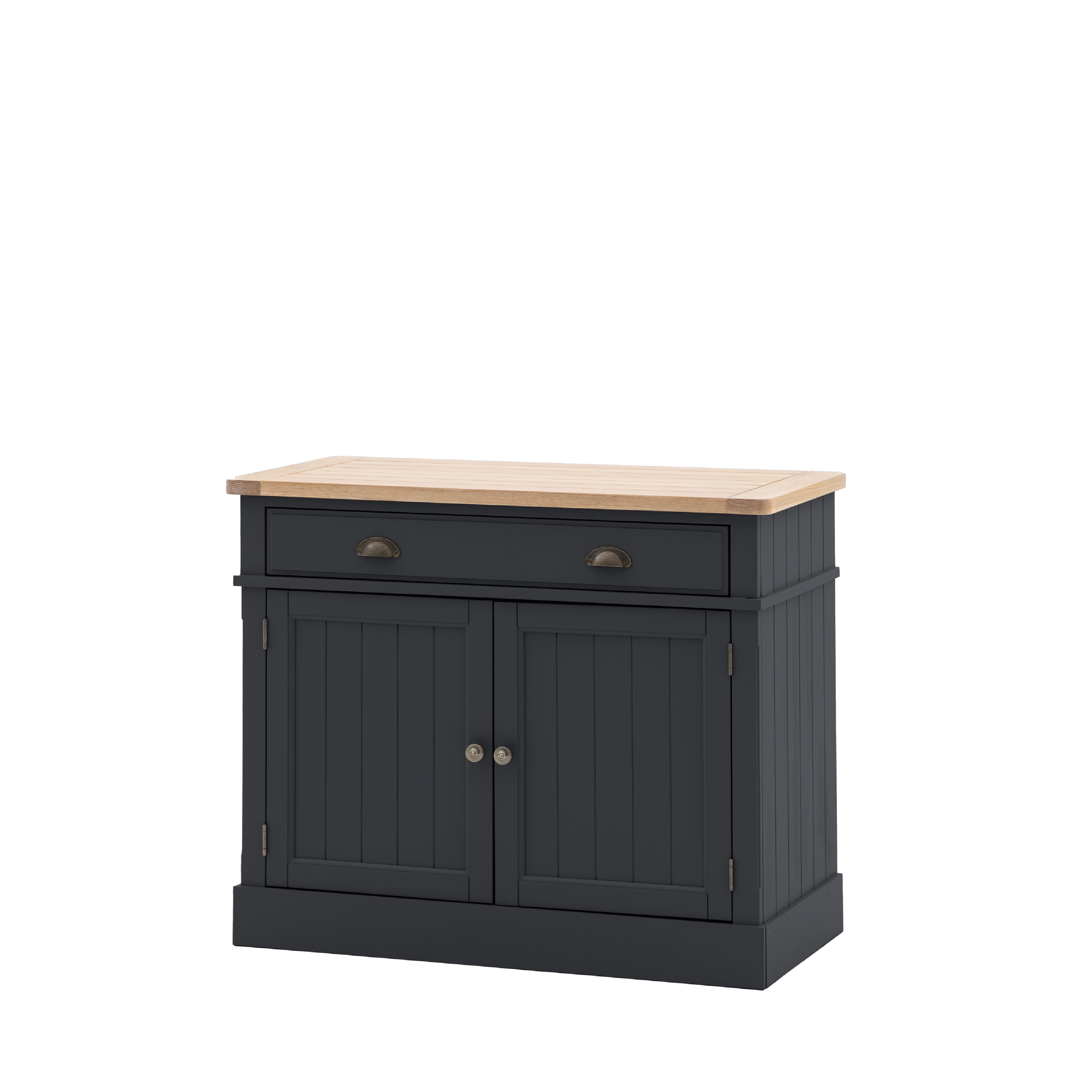 This sideboard combines traditional charm with contemporary style. Offering practical storage with a single large drawer and 2 door cupboard with adjustable shelves, there's plenty of storage space. The combination of the grooved & planked oak veneered MDF top with hand painted textured finish base, grooved doors and traditional style metal handles gives the sideboard a modern twist on a country classic style. Due to the handmade nature of this product colour variations may be present.