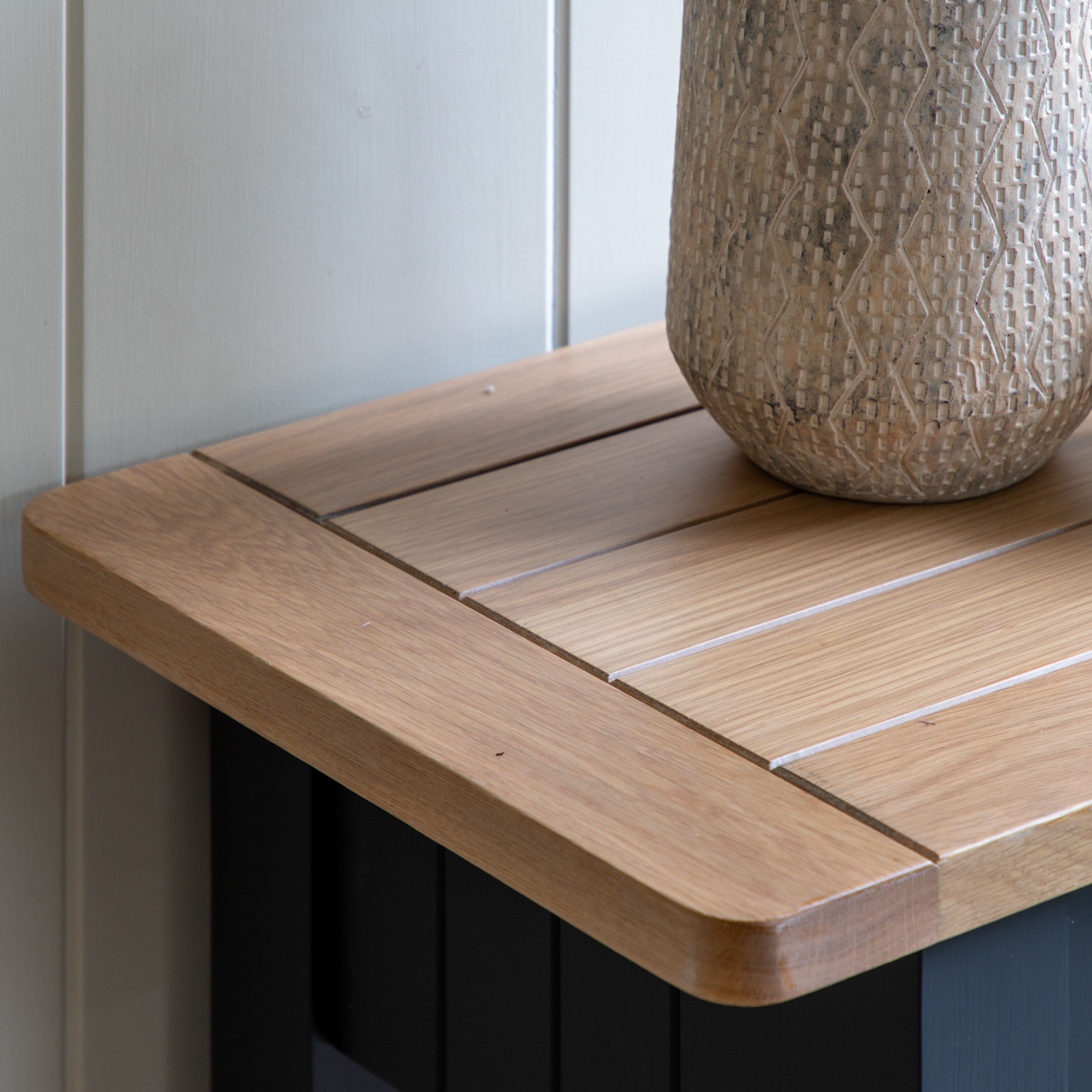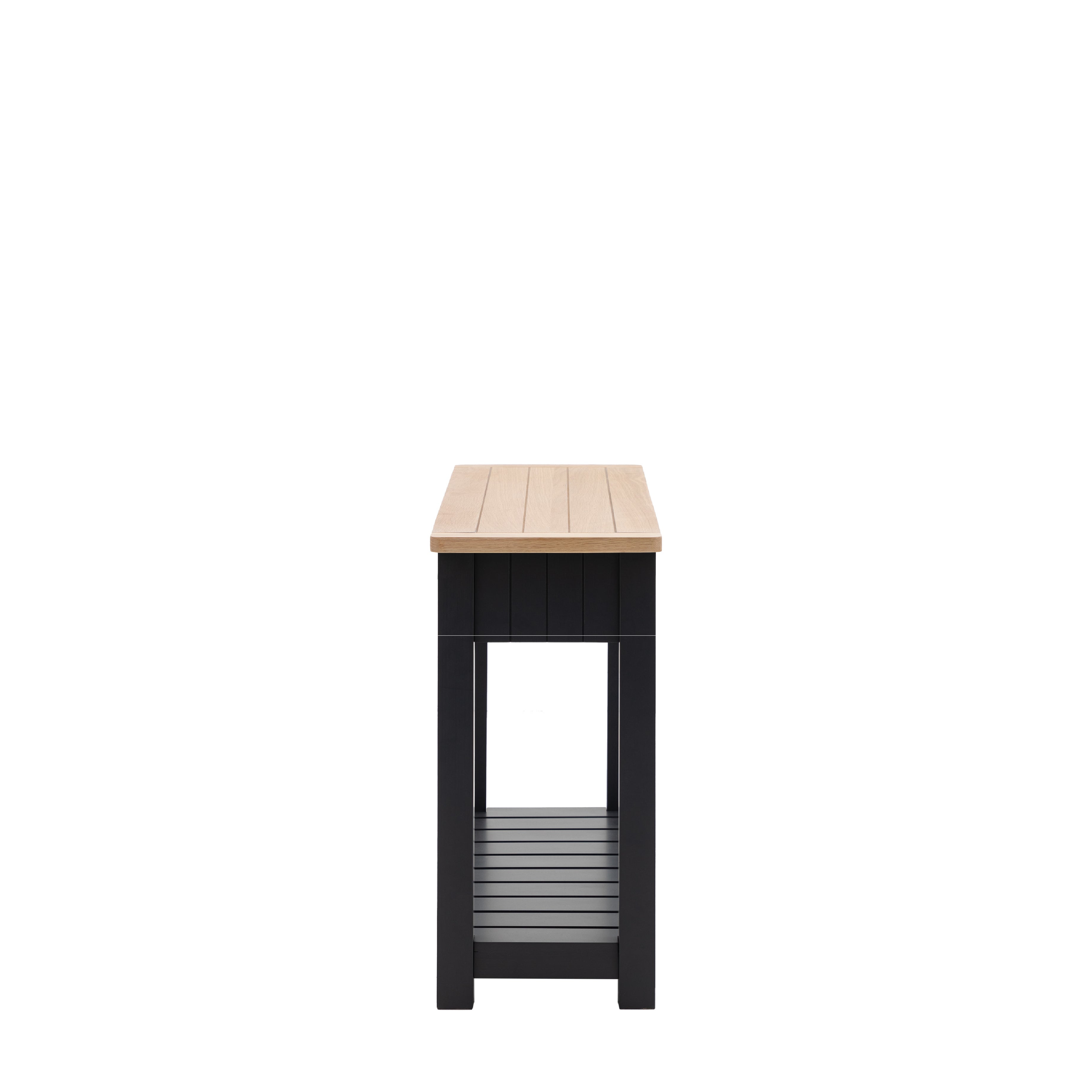 A modern update on a country classic, this console table is a versatile piece perfectly suited to both contemporary and rustic interiors. Featuring 2 drawers and a low shelf, the console table is perfect for living rooms, dining areas and kitchens alike, offering great additional storage. The hand painted subtly textured finish with metal drawer pulls and grooved & planked oak top add a modern twist to this country style console. Due to the handmade nature of this product colour variations may be present.