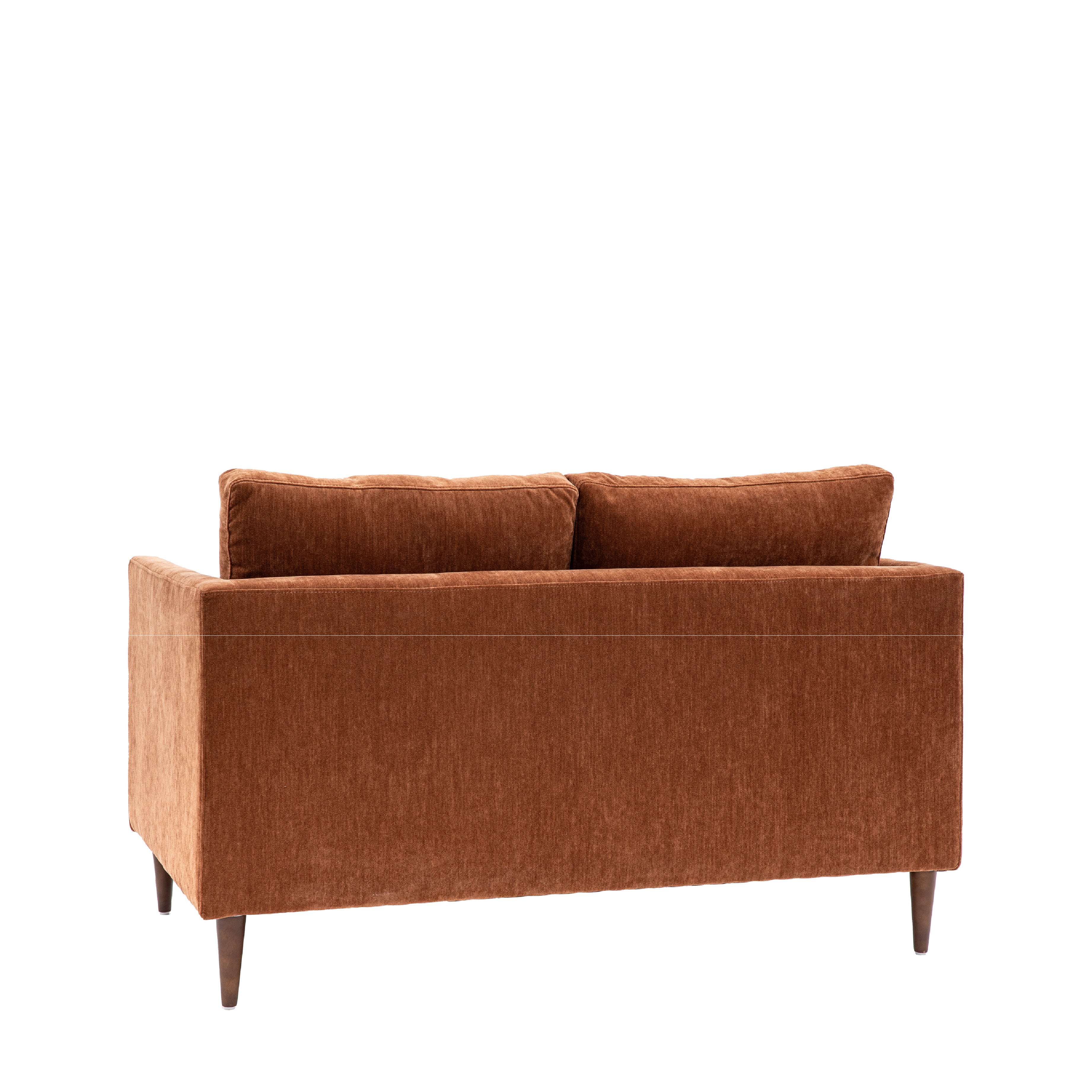 This contemporary 2-seater sofa offers a simple stylish design which would suit a wide range of interiors. Upholstered in a beautiful rust coloured fabric with deep seat and back cushions for comfort, the turned wooden legs echo the shape of the gently tapered arms in a lovely design detail.