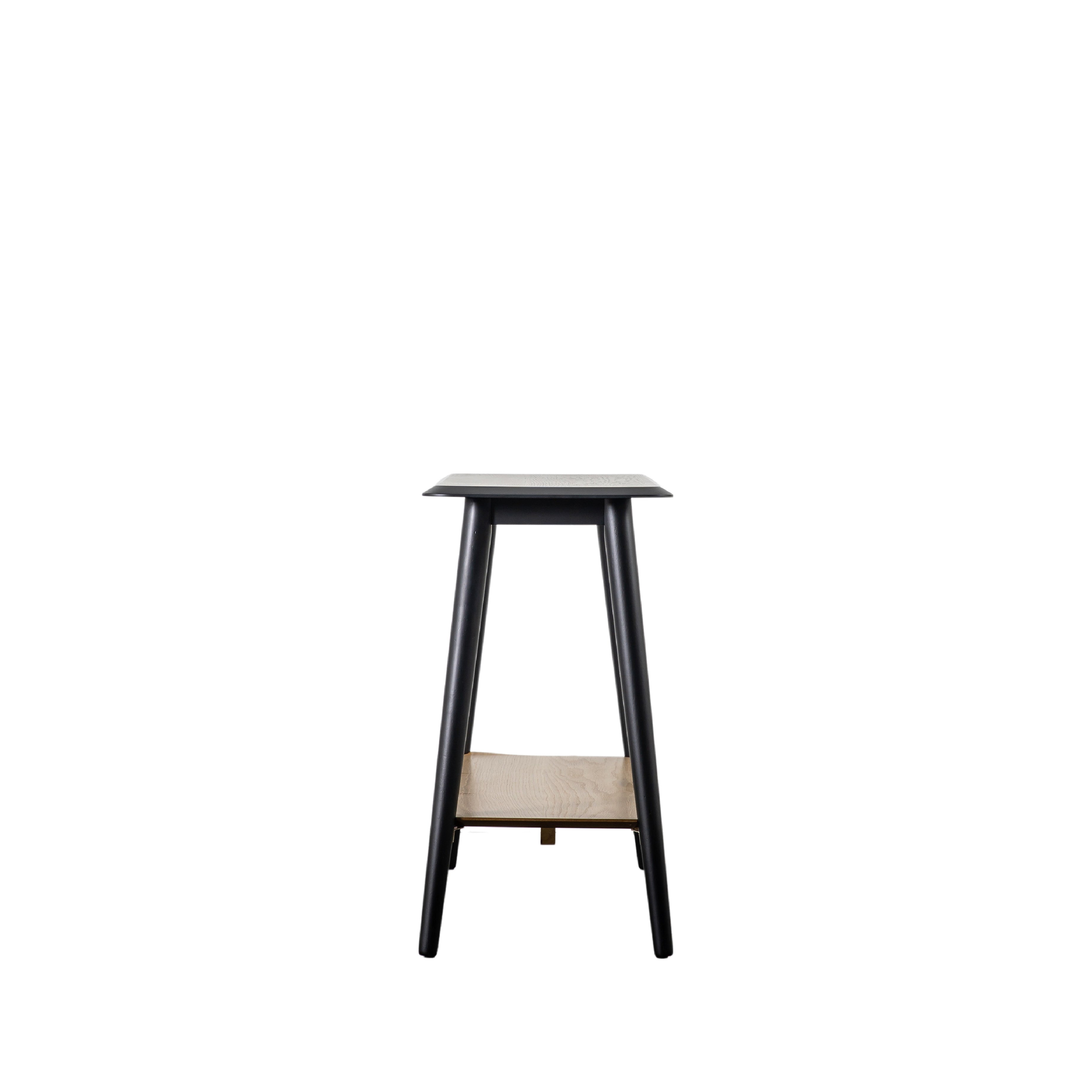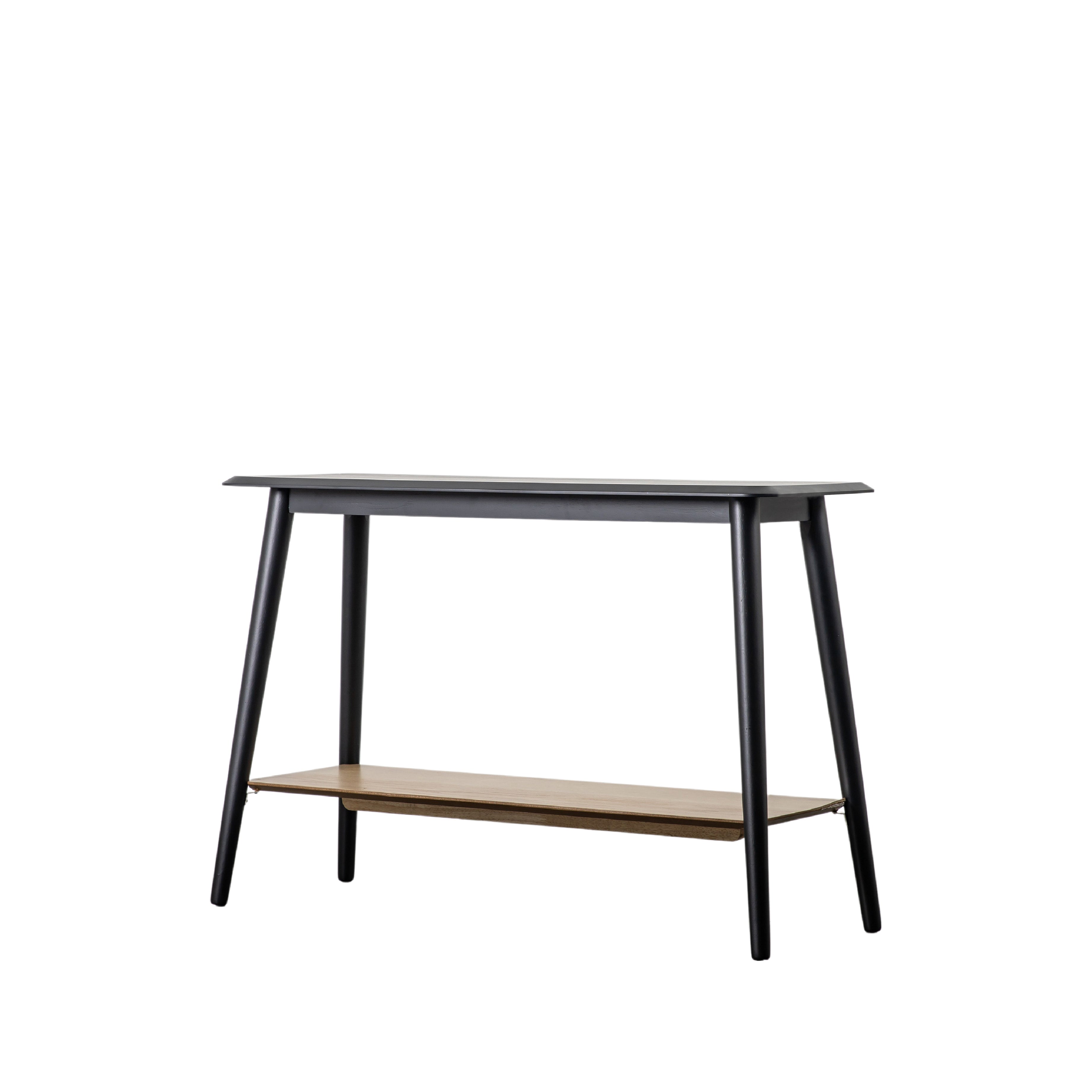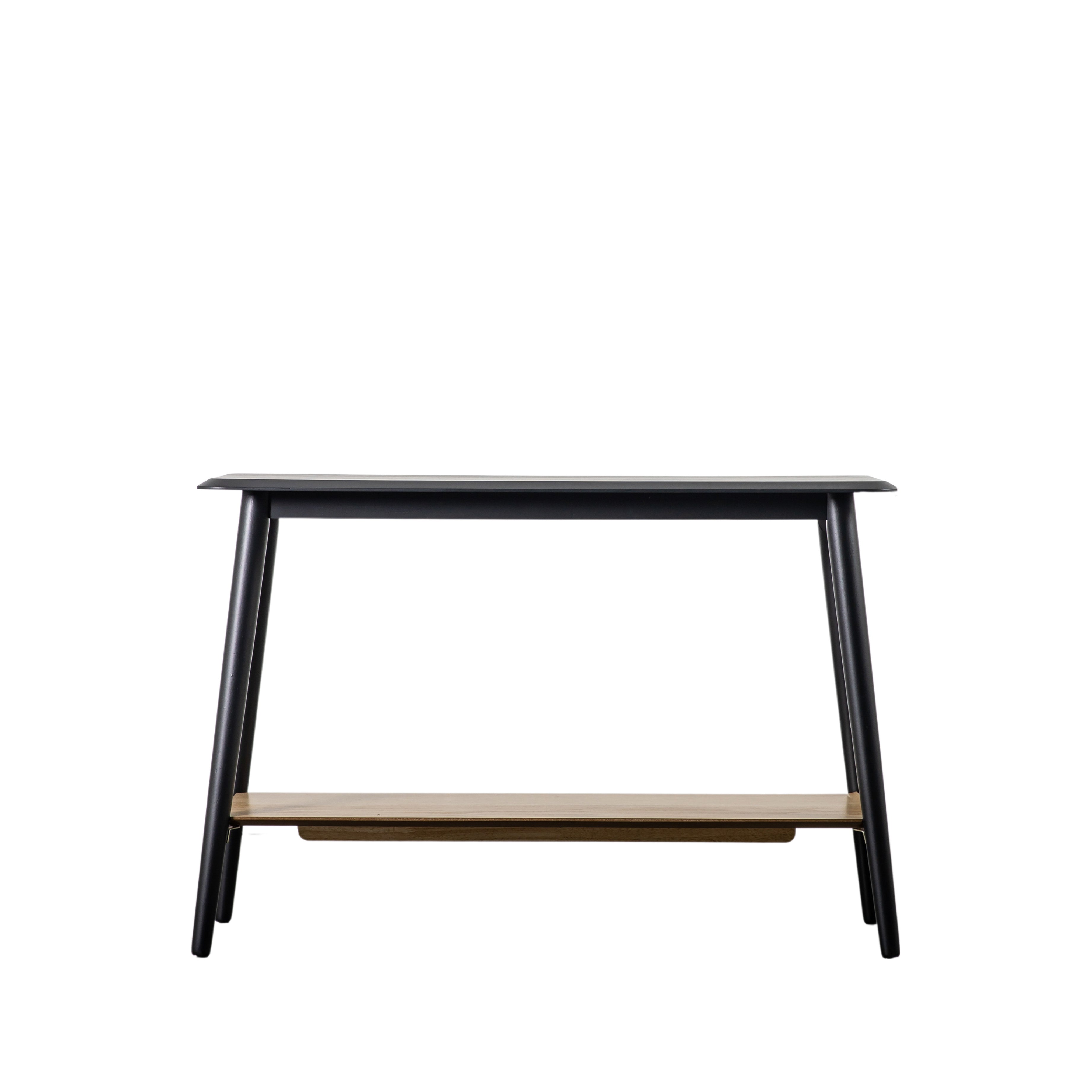 Offering a modern twist on mid-century style, this lovely console table features solid timber legs in a black finish paired with a black oak veneer top and a natural oak veneer shelf to add contrast for a more contemporary look.