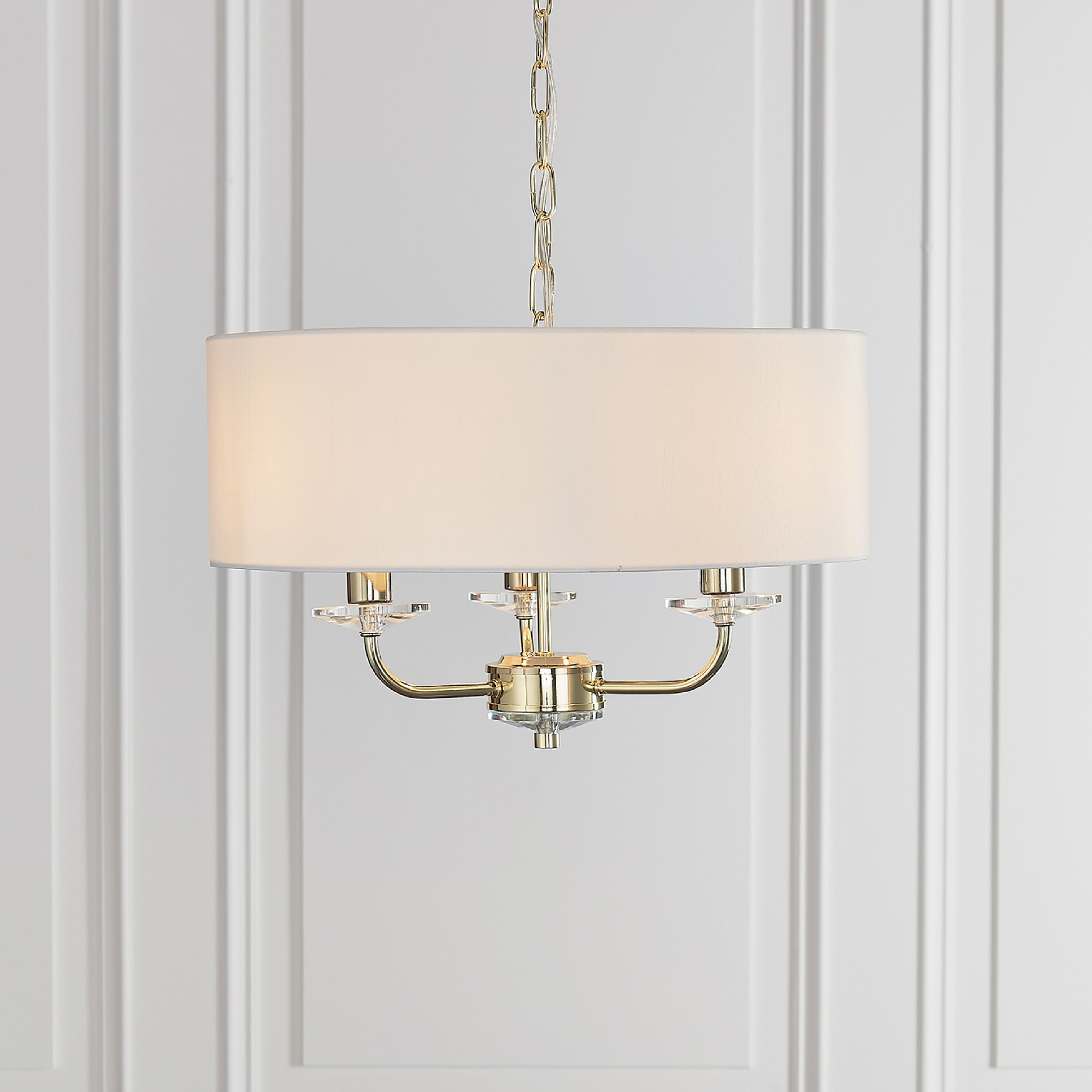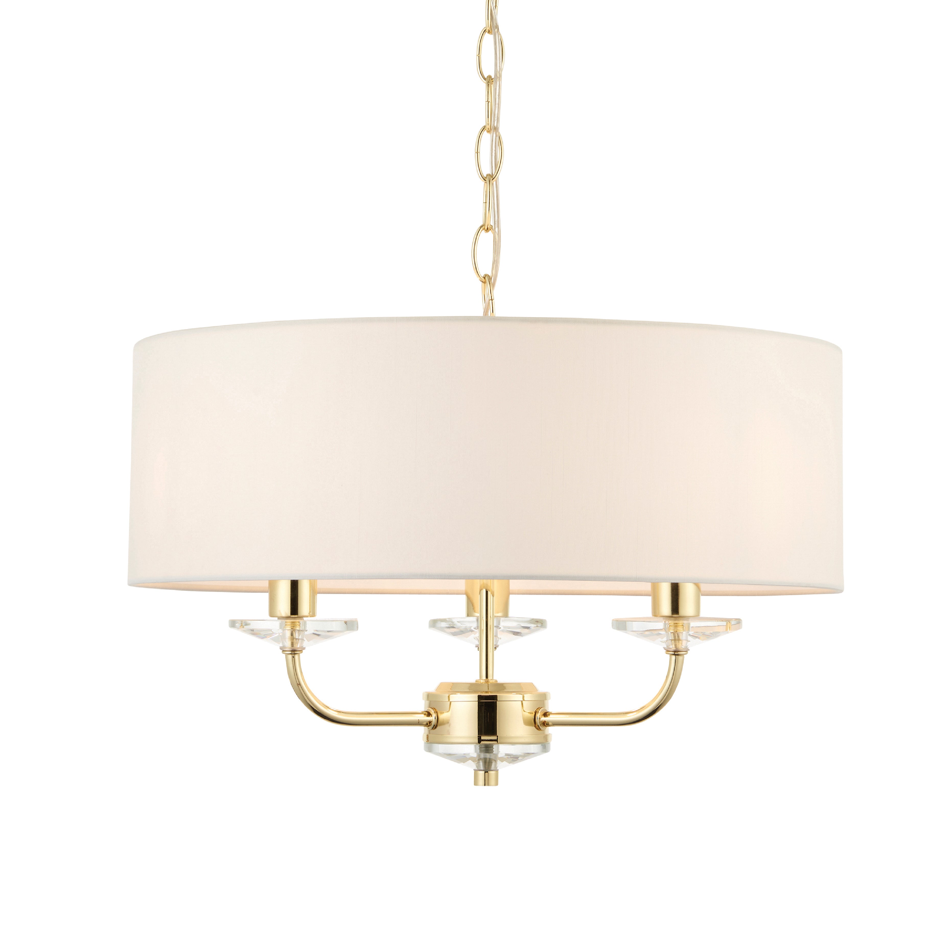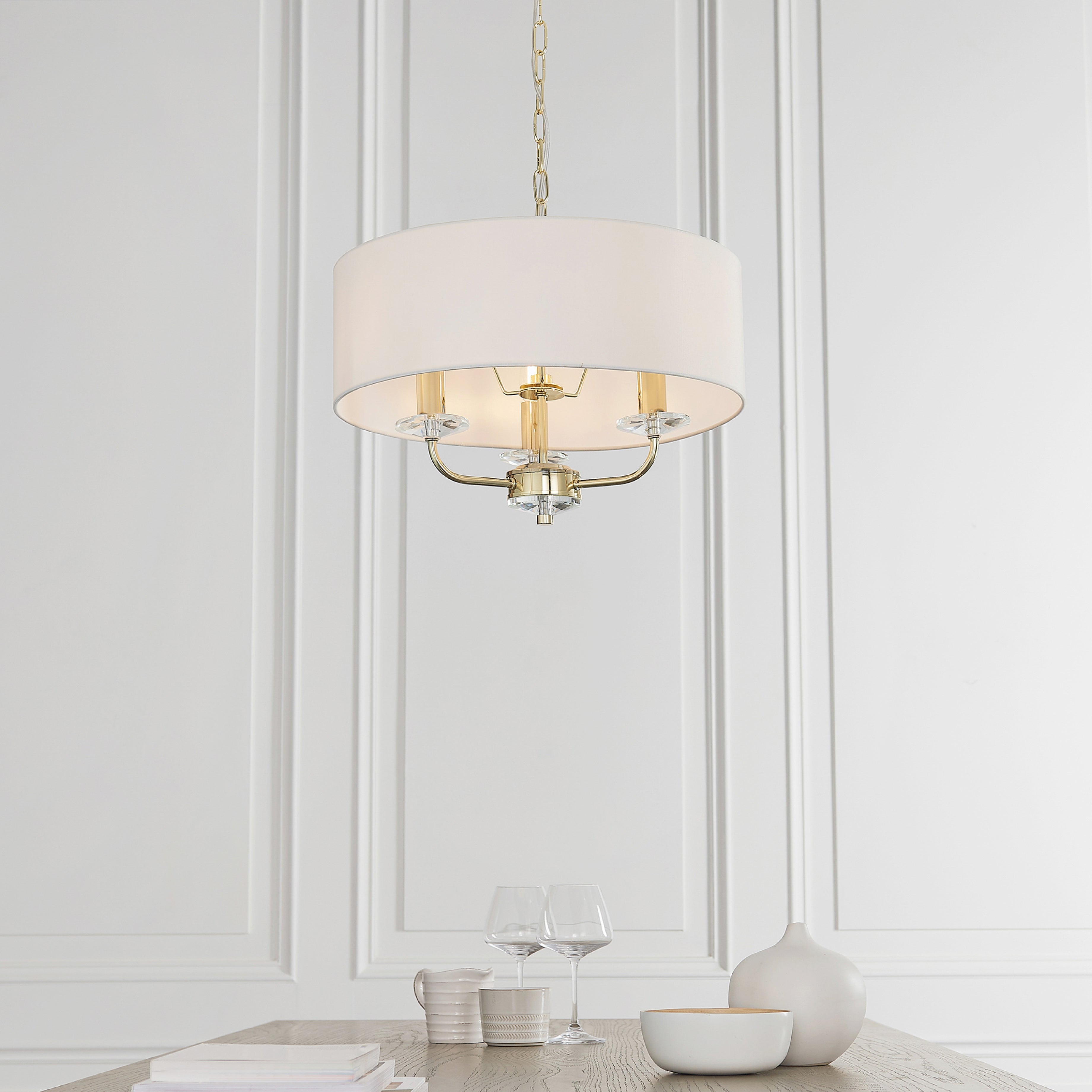 This 3-light ceiling pendant is finished in a brass effect plate. The 3 arms are complemented with a touch of crystal and the fitting is topped with a narrow, vintage white, faux silk shade. Height is adjustable, and the fitting is dimmable and suitable for use with LED lamps.