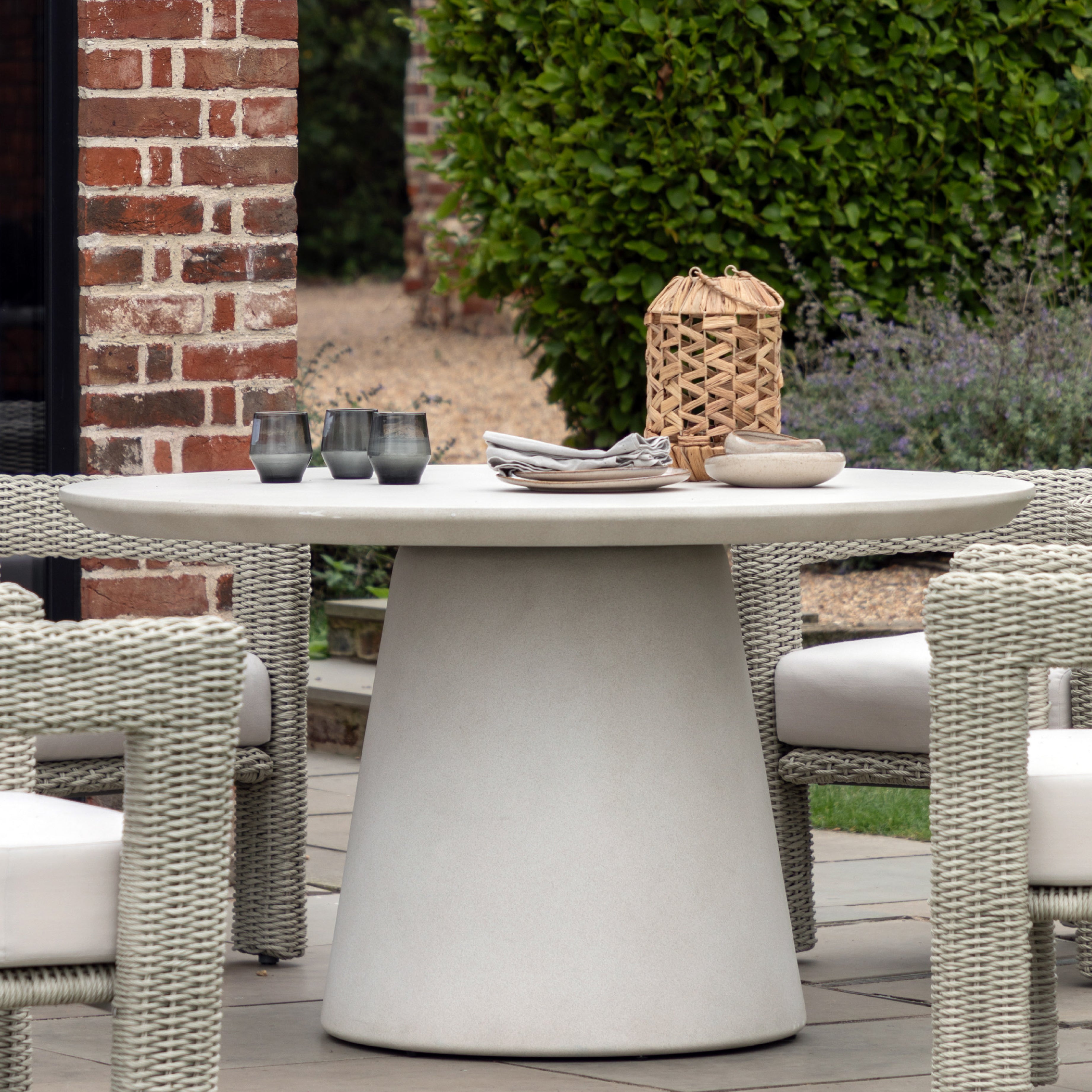 Gallery’s outdoor dining table of the Hvar Collection combines the classic and the contemporary. Crafted from reinforced concrete, it features a rounded top and sculptural tapered base. Designed to fit four comfortably - it’s made just for long dinners and lively conversation.