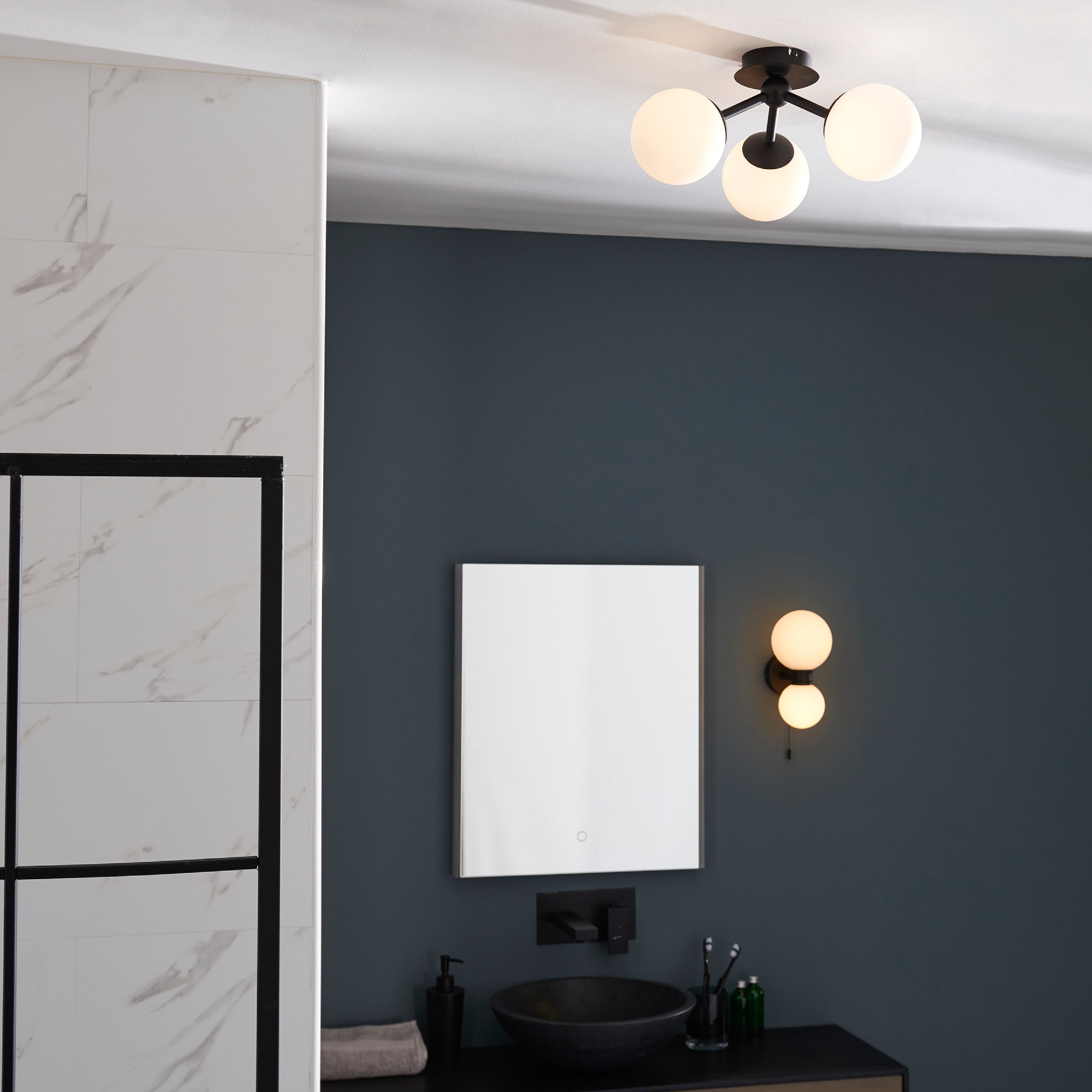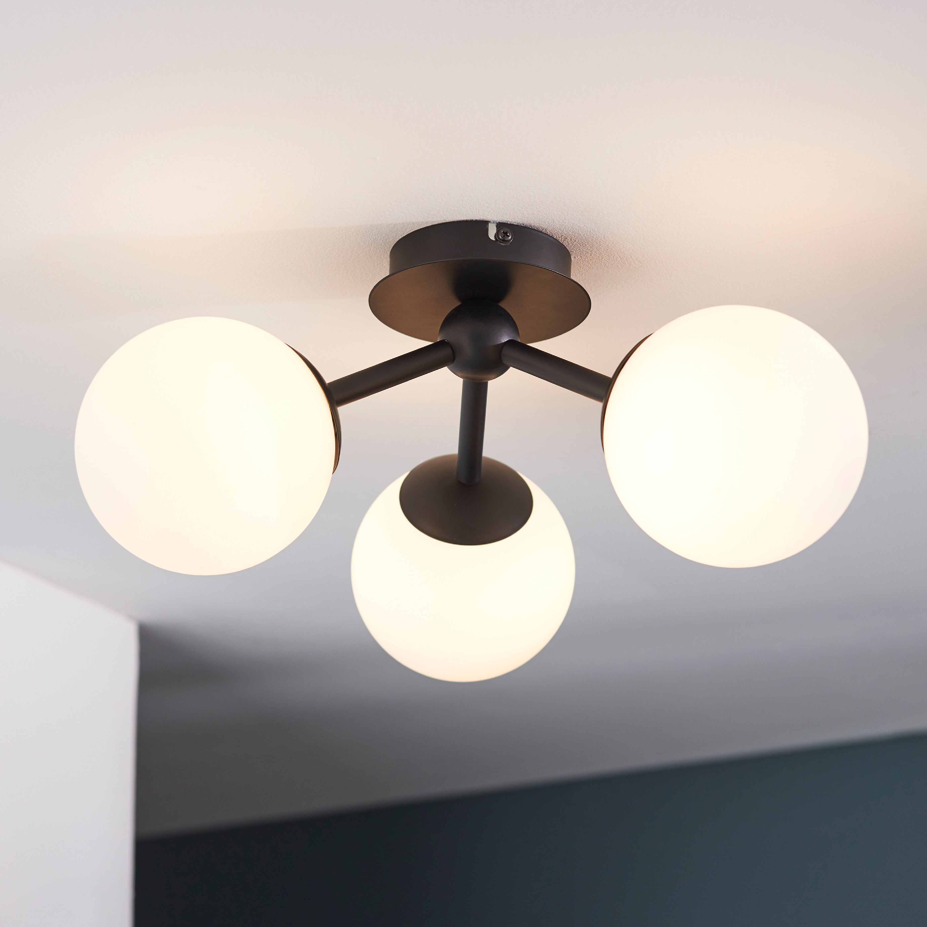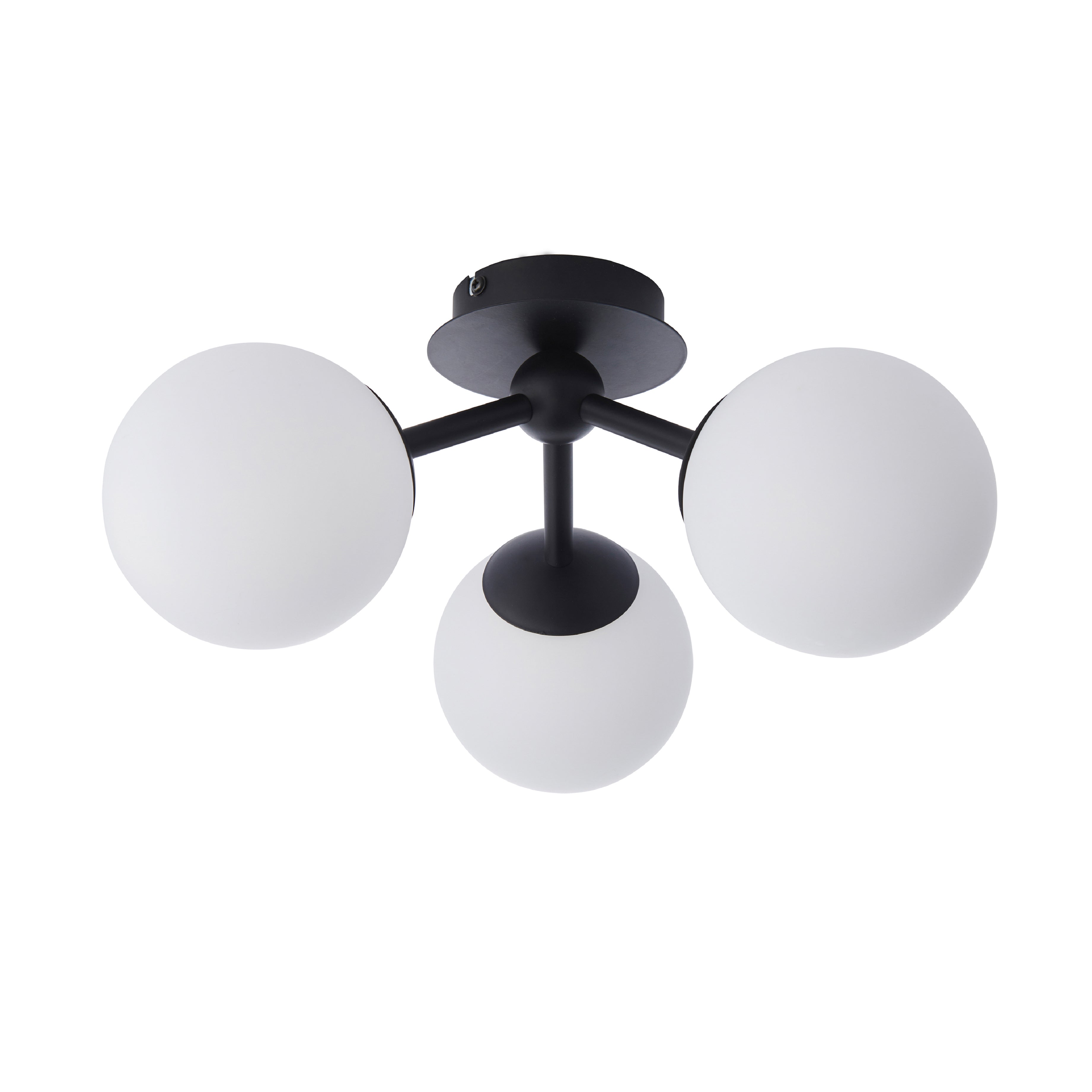 Stylish contemporary semi flush light combining matt black steel with matt white glass. Perfect design for low ceilings and suitable for bathrooms due to its IP rating. This product is dimmable.