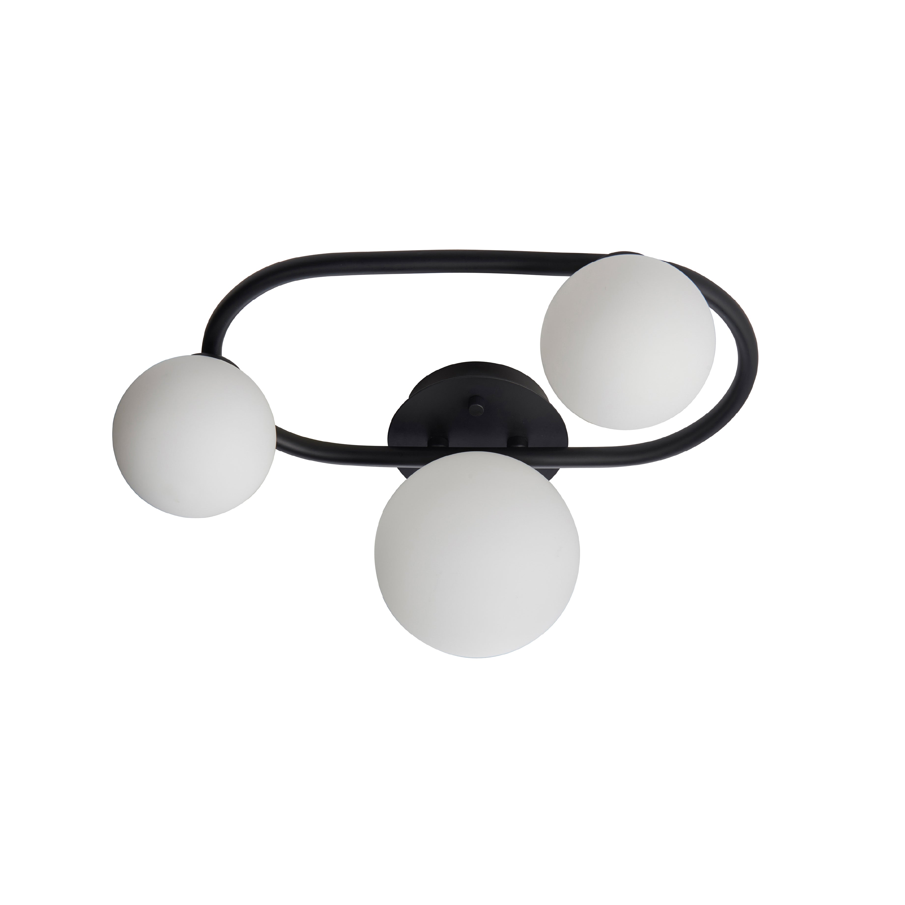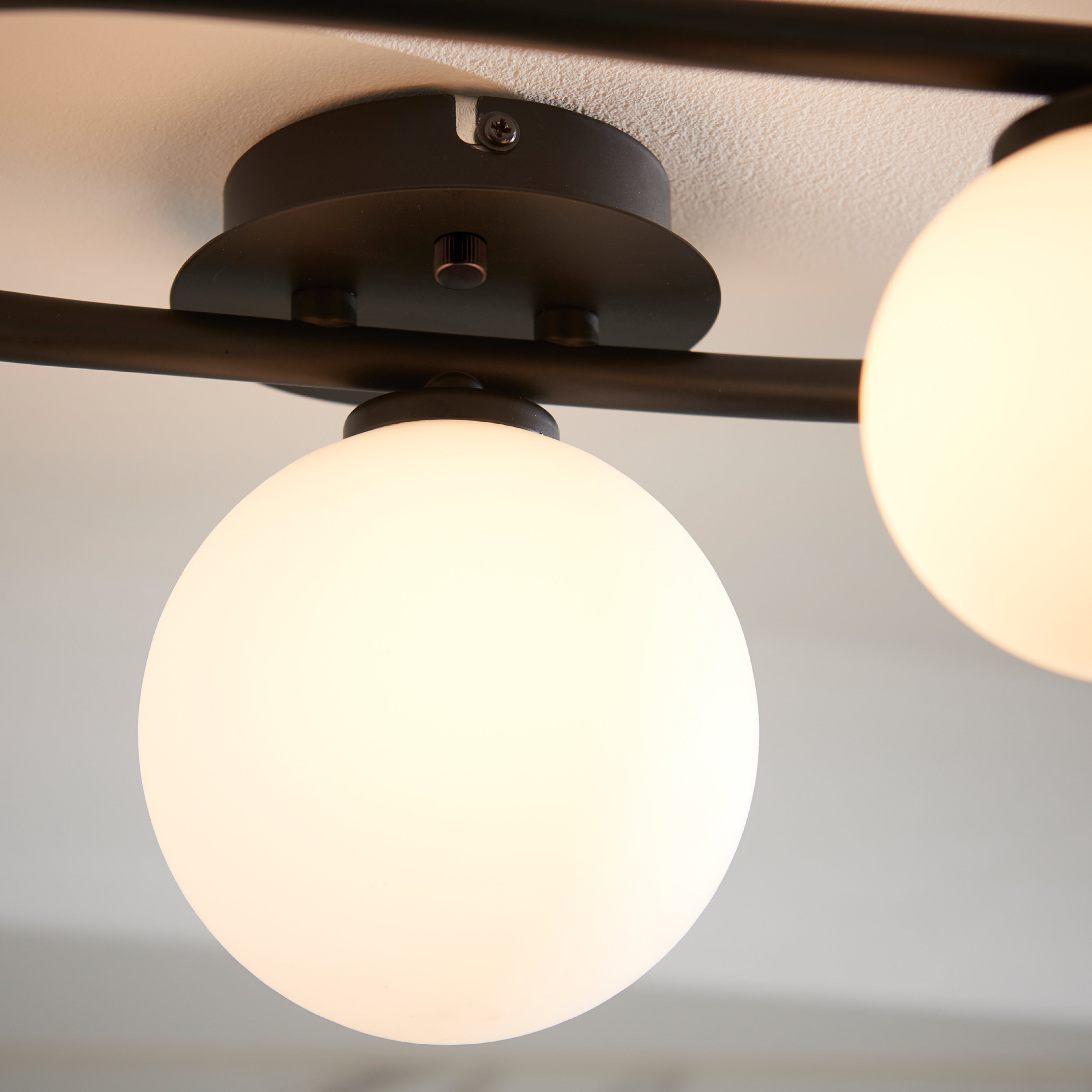 Stylish contemporary semi flush light combining matt black steel with matt white glass. Perfect design for low ceilings and suitable for bathrooms due to its IP rating. This product is dimmable.