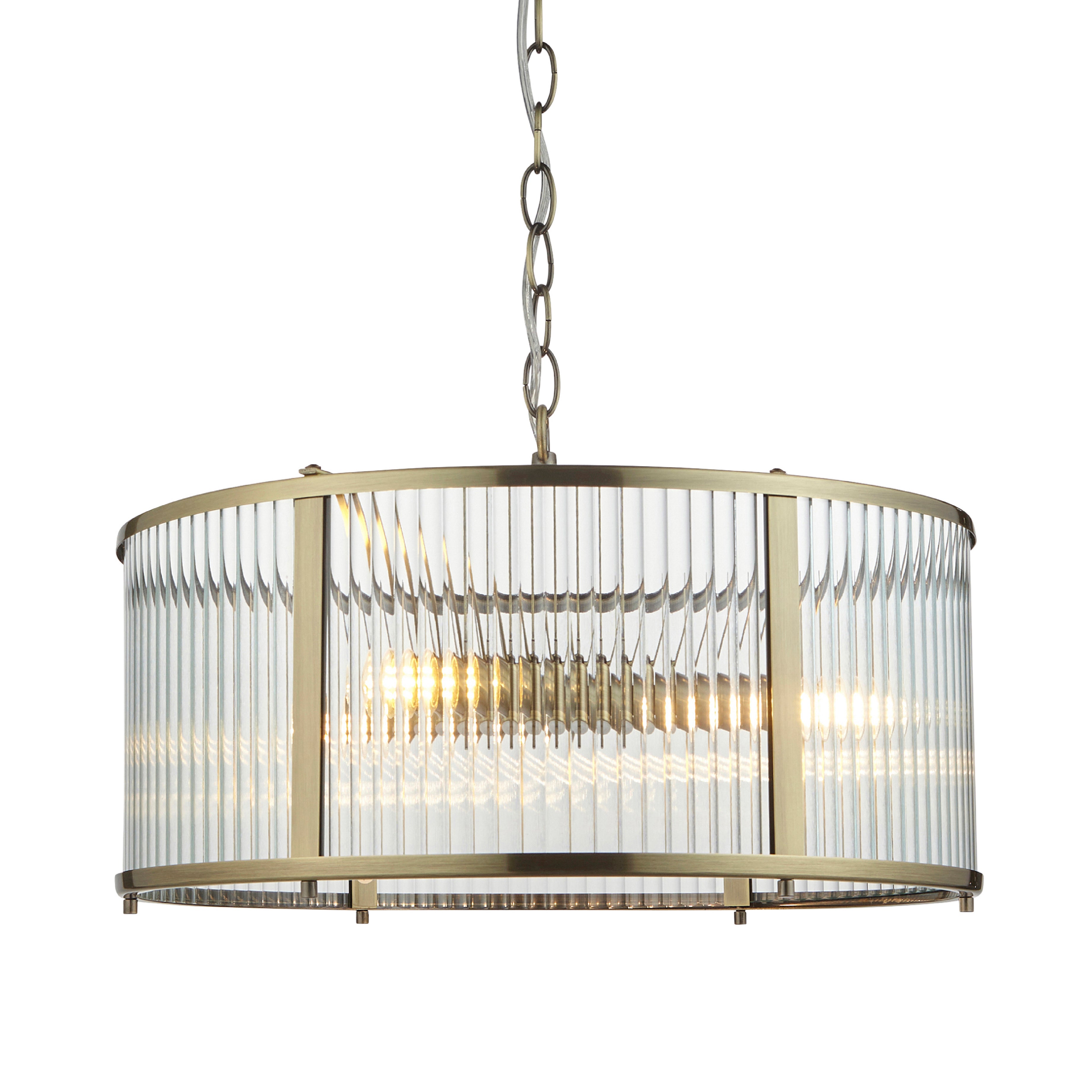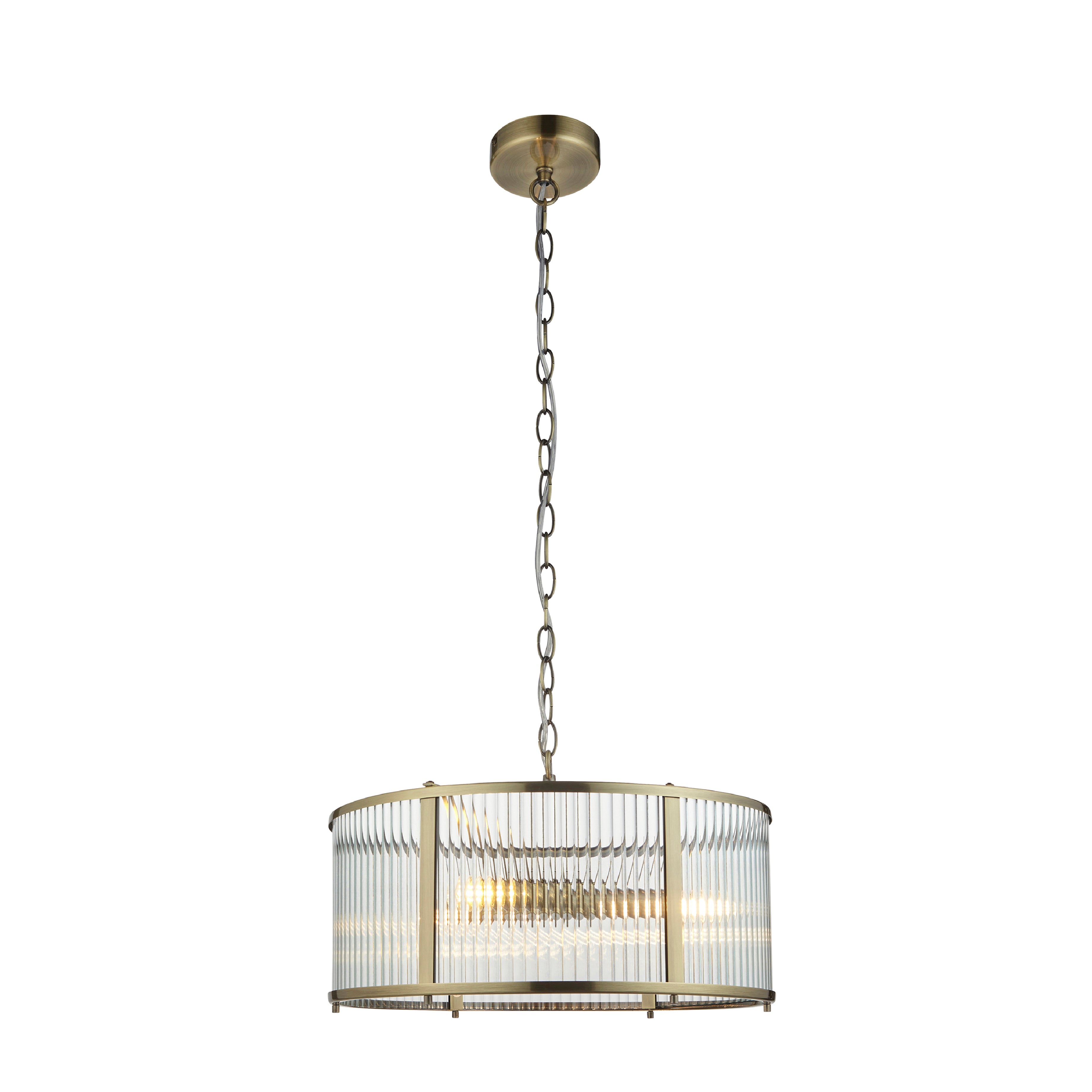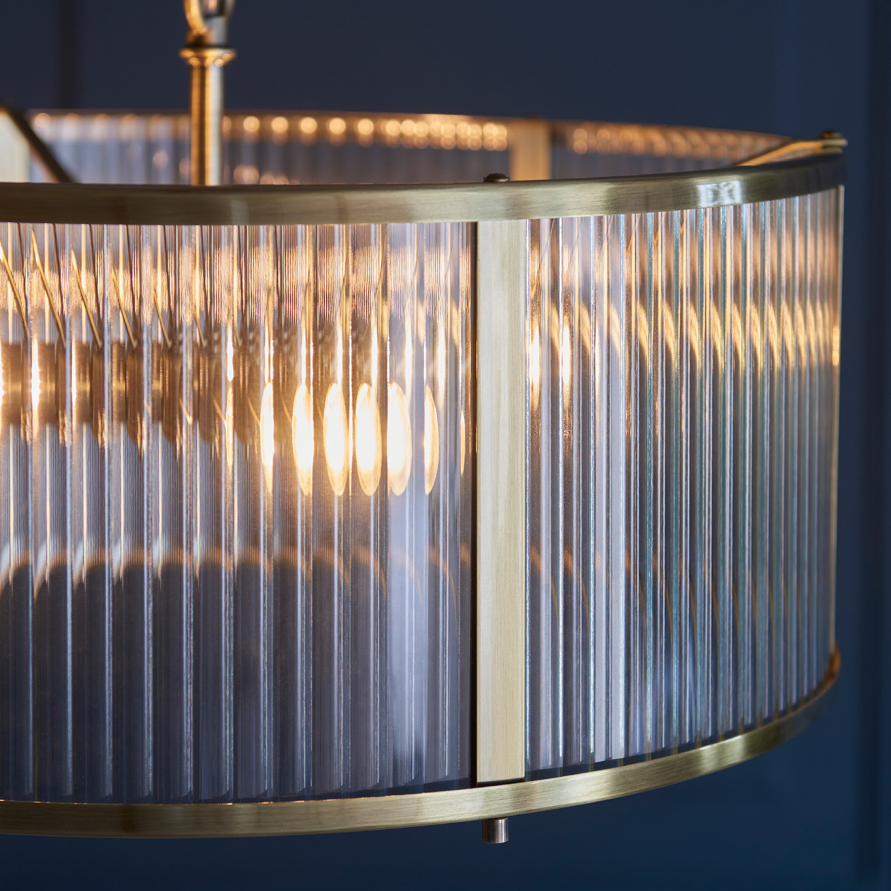 Timeless classic pendant with antique brass plated metalwork, the clear ribbed glass panel shades beautifully diffuse the light. Height adjustable chain means this can be perfectly placed to illuminate hallways, living spaces or dining rooms.