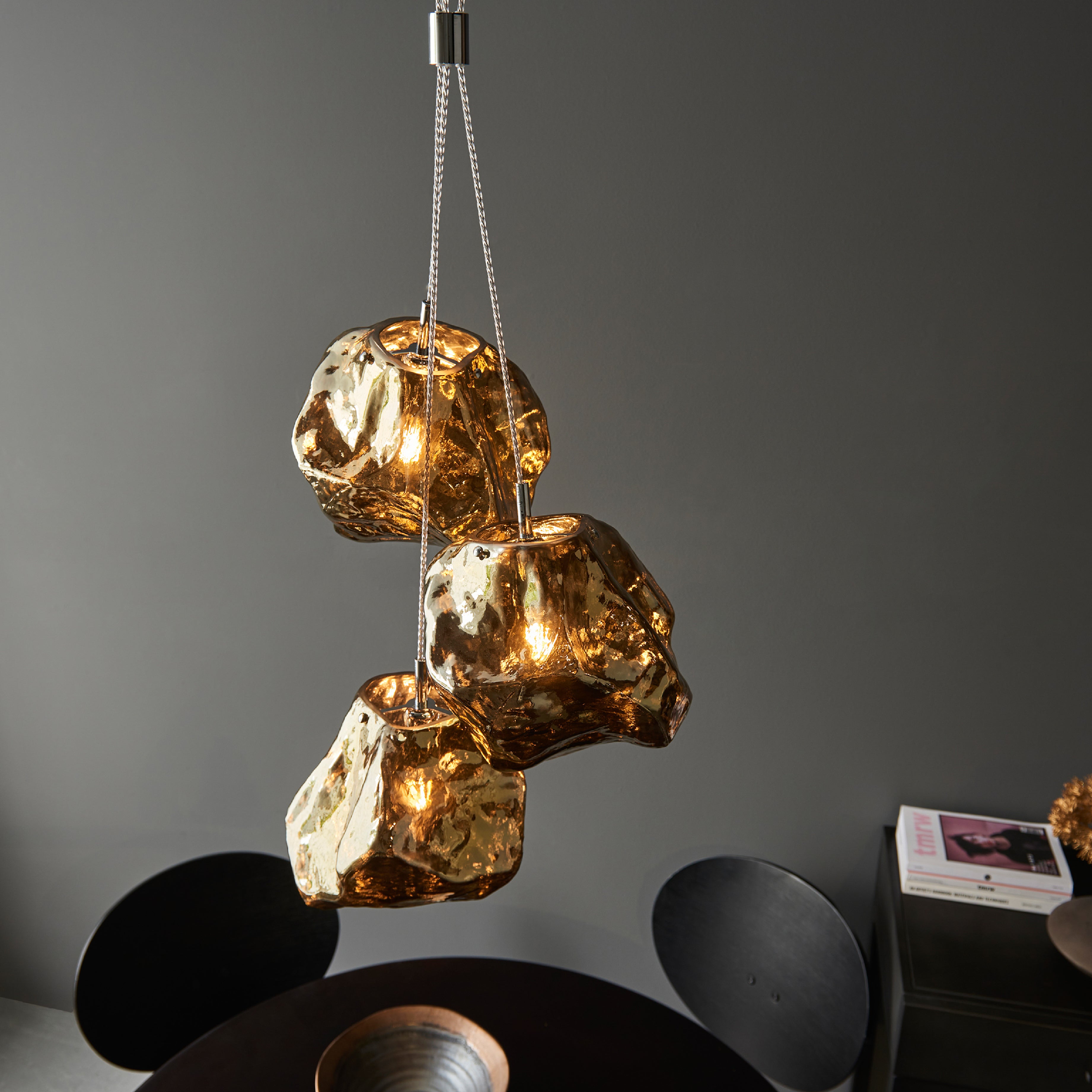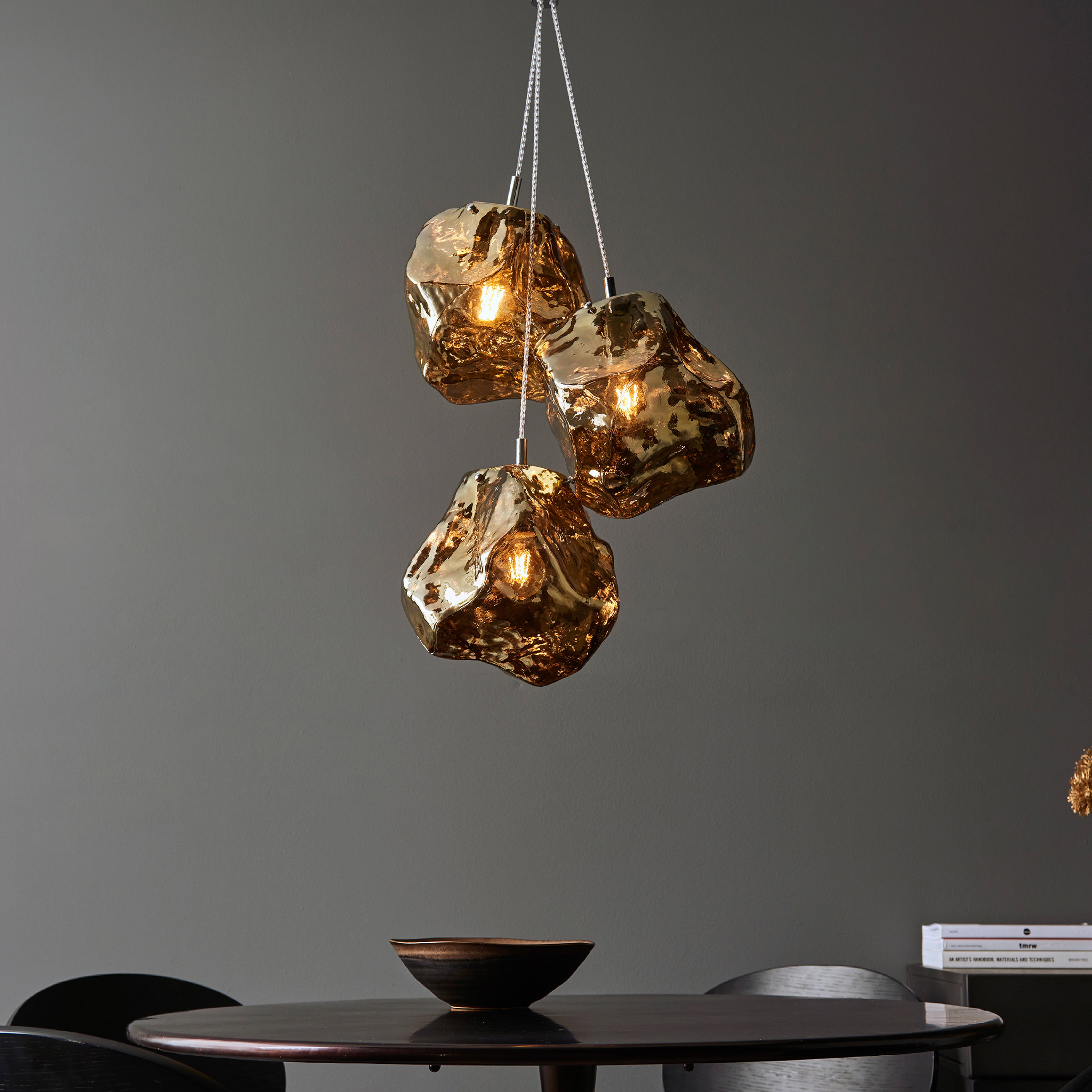 Inspired by volcanic rock formations, this statement pendant in metallic bronze emits an attractive ember glow and features an adjustable detail allowing you to alter the shape of cables. Perfect when paired with LED filament lamps