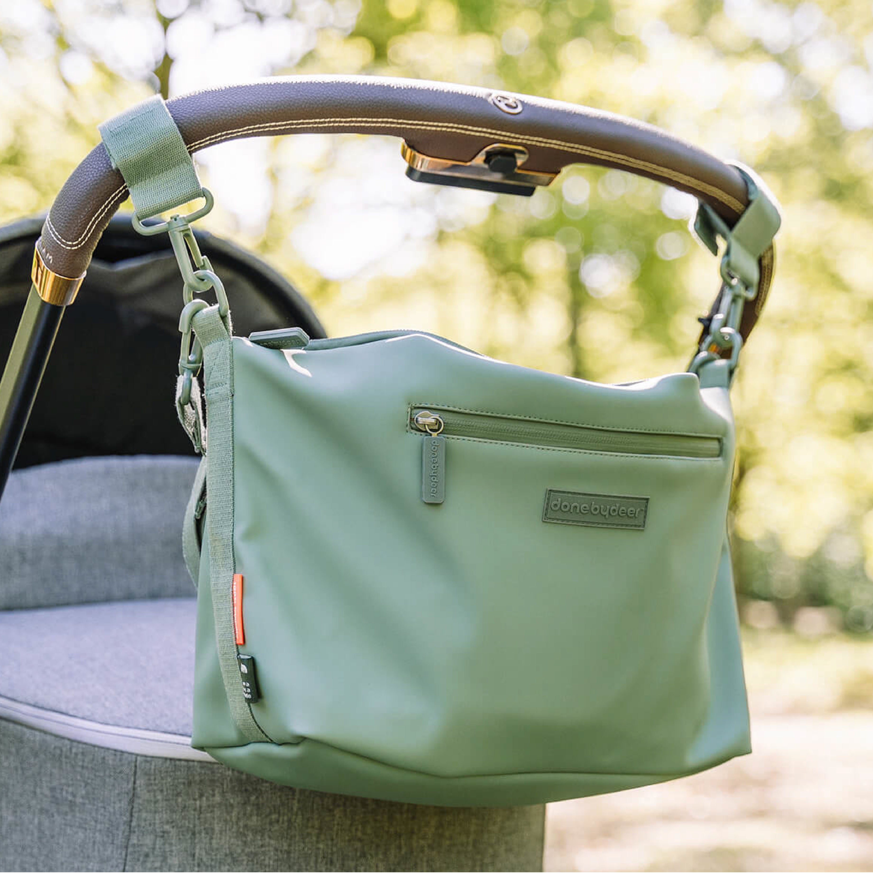Done by Deer’s stroller bag marries form and function. Crafted from plush recycled polyester coloured green, it features four inner pockets and a handy outer pocket for smaller essentials. Offering a no-fuss adjustable strap and pram hooks, and complete with a water-resistant finish - Done by Deer’s stroller bag is designed to endure every outing.