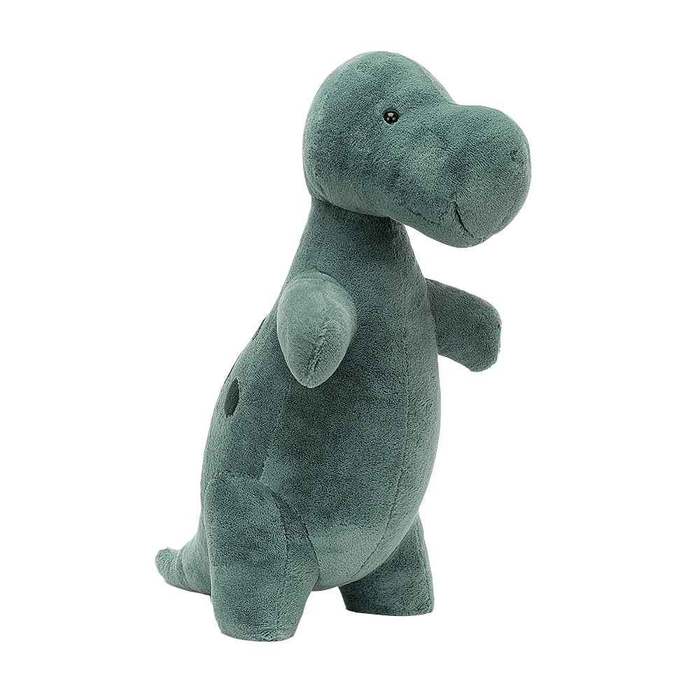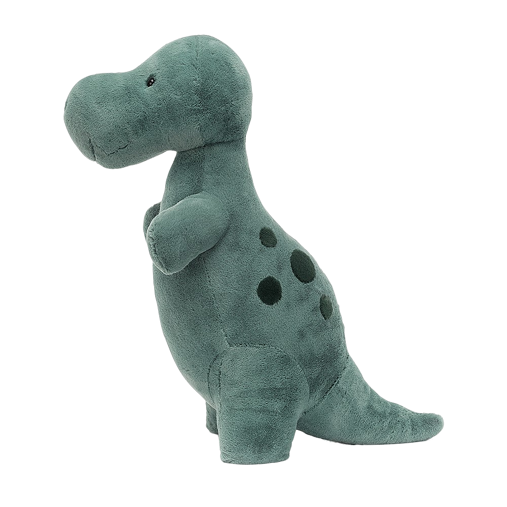 A sturdy stomper with short squishy paws, Big Spottie T-Rex is simply rawrrrsome! Mossy green with a podgy tummy, stubby legs and a squidgy tail, this dino has gorgeous dark green spots. With a chunky nose, affable smile and timeless charm, you can count on a t-rex for excellent schnuggles!