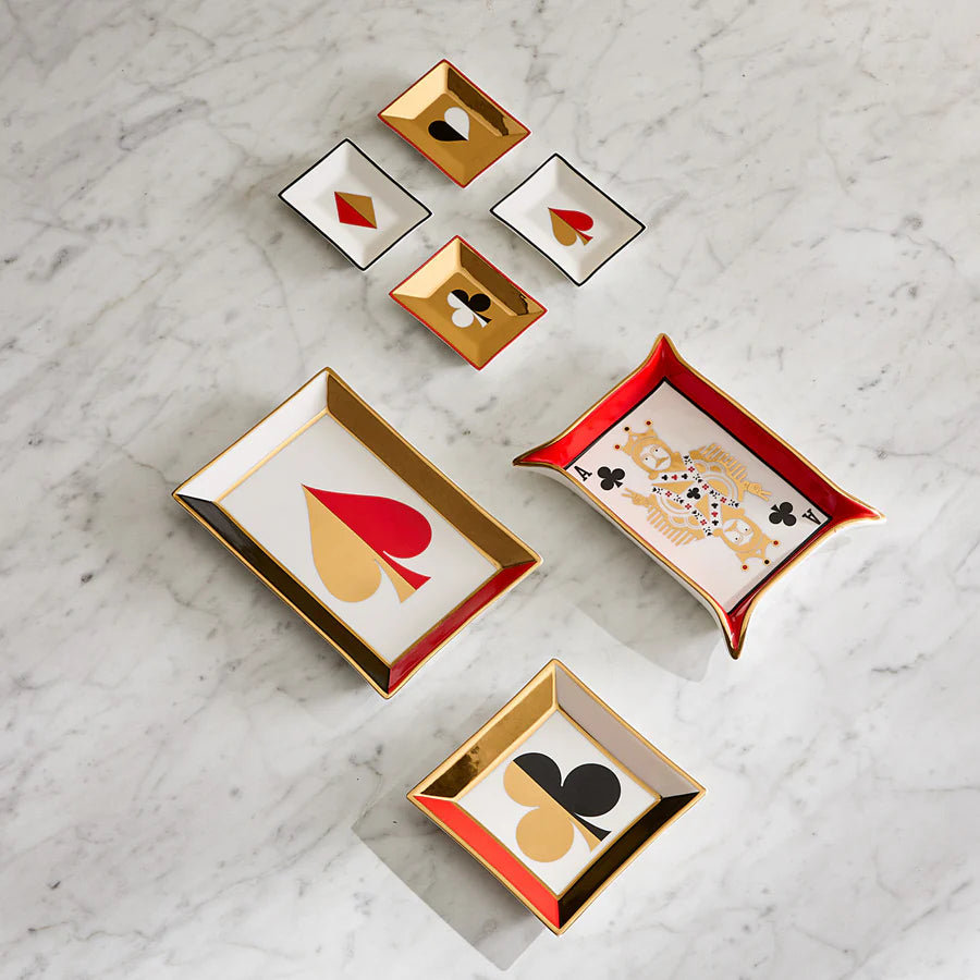 Take a risk with Jonathan Adler's valet tray of the Dealer's Choice Collection. Crafted from high fired porcelain, it features a brilliant playing card motif at its centre, and comes complete with beautiful gold details. Whether stashing trinkets or making its statement solo - Adler's valet tray is the go-to for maximalist interiors.