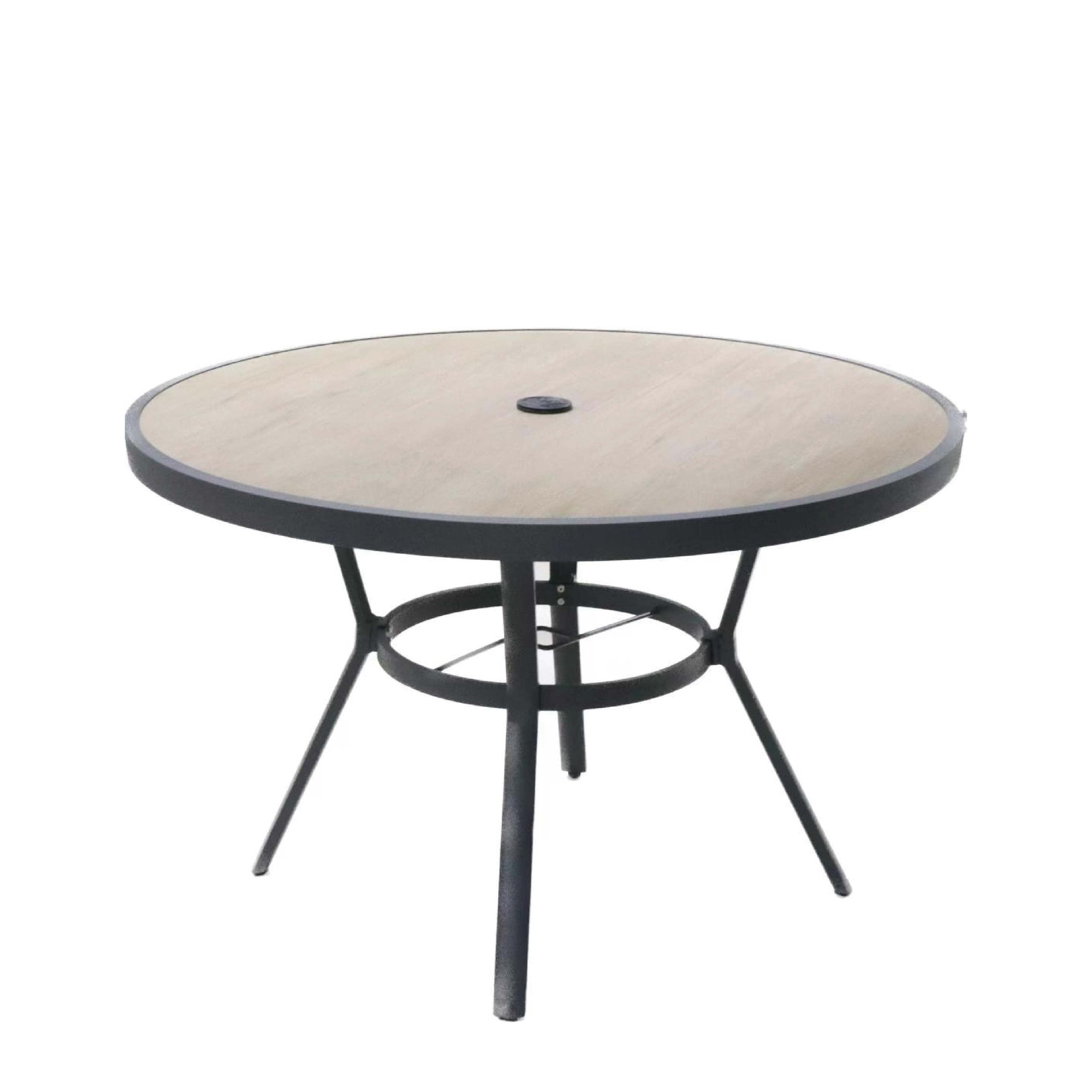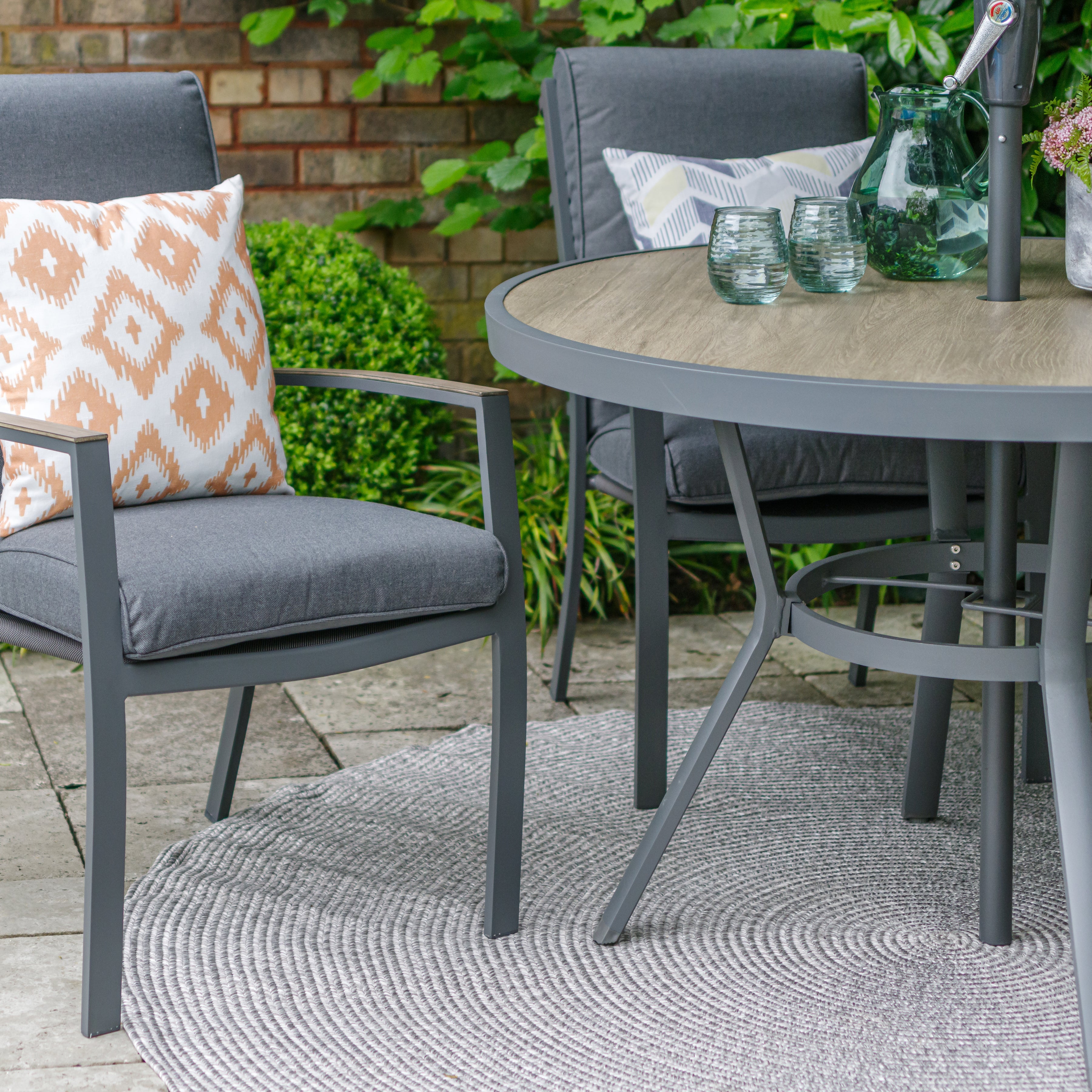 Featuring sleek double powder coated aluminium frames with rustic wood effect accents - LG’s round dining table offers the best in both form and function. Please note: chairs and parasol are not included.