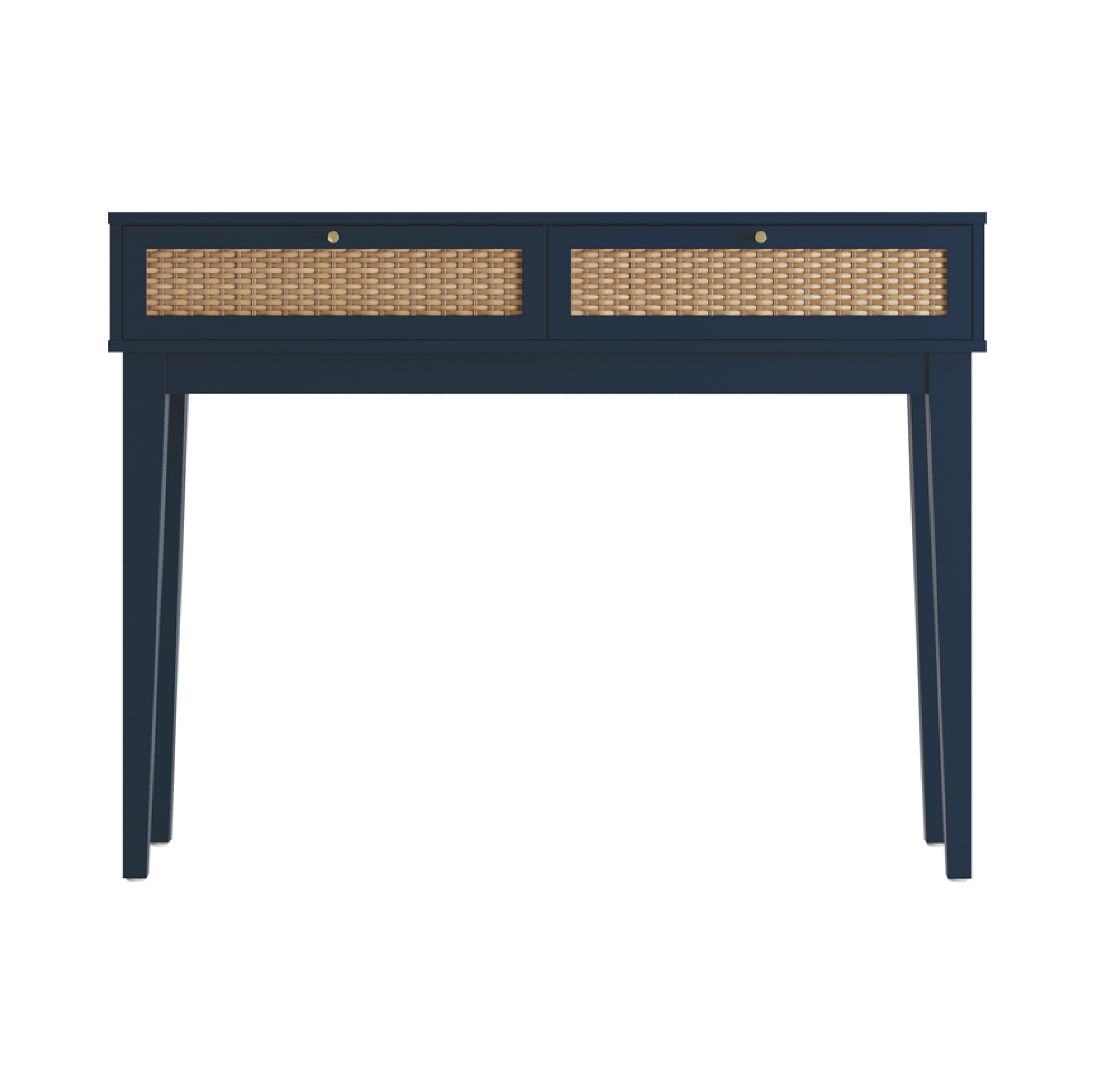 Elevate your bedroom decor with LPD Home’s Bordeaux Dressing Table. It features two spacious drawers for your accessories, and its eye-catching rattan-effect front exudes natural elegance. Satin gold handles enhance its appeal, while the deep blue frame and tabletop add a sleek and stylish touch to any room.