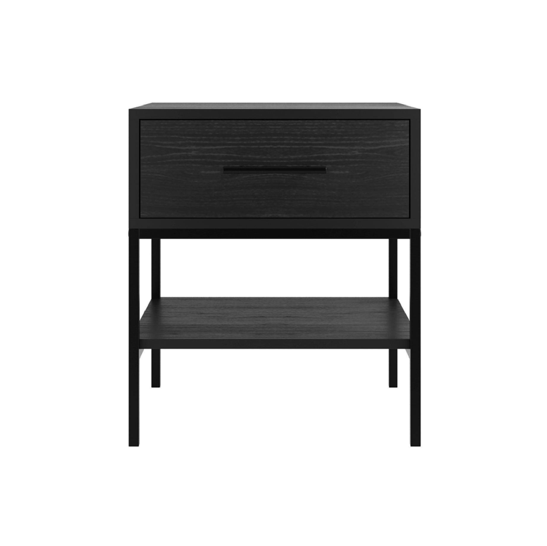 The Boston Bedside Cabinet in Matte Black offers a sleek and functional addition to any bedroom. It has a black wood grain finish, one drawer for convenient storage and metal legs for a modern touch. An additional shelf under the drawer provides extra space for your essentials, combining practicality with contemporary style.