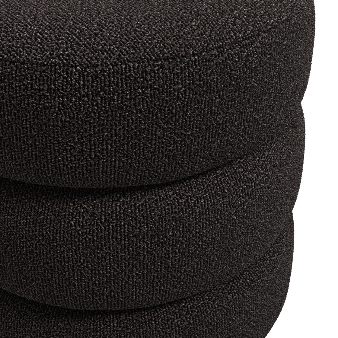 Introducing the Emi Pouffe in Black, a contemporary marvel crafted from luxurious velvet material. Its unique circular design is elegantly elevated by round wooden feet for a touch of sophistication.