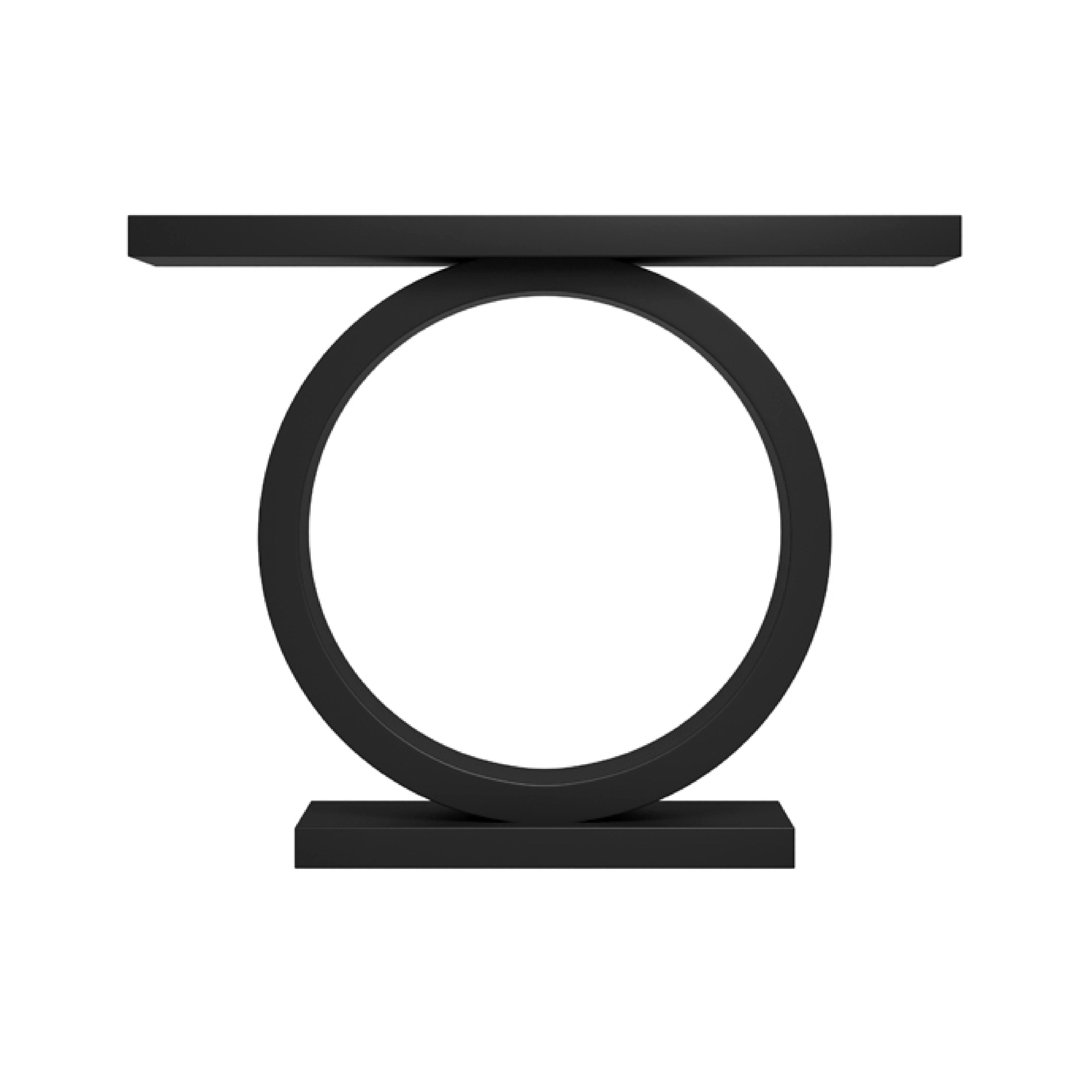 Crafted with black oak veneer, the Oren Console table has an elegant design accentuated by a unique circular leg, adding character to any room. Perfect for the hallway, living room, or bedroom, it provides a stylish platform for displaying your favourite interior items.