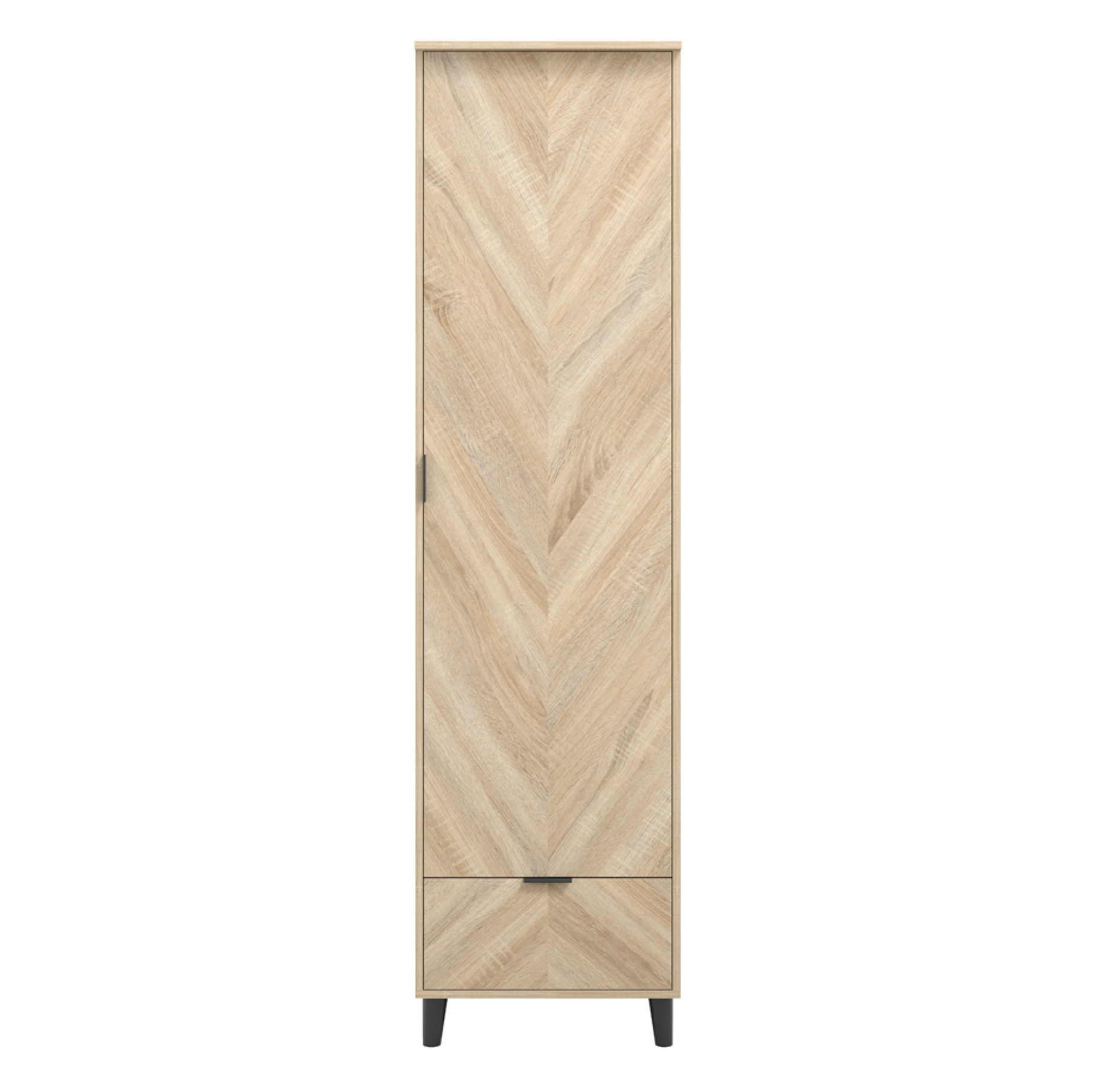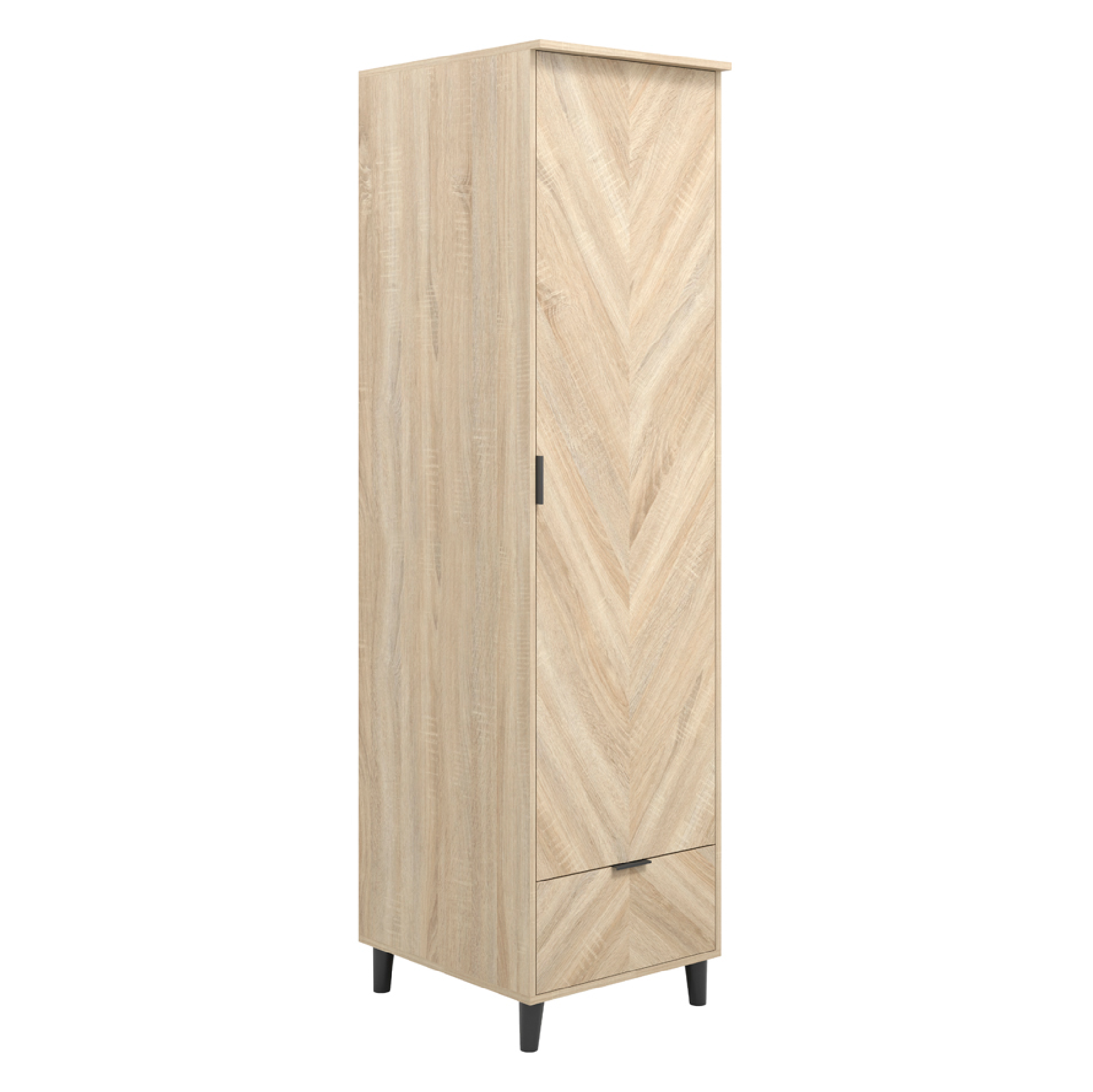 Elevate your storage game with LPD Home’s Stockholm 1-door wardrobe, which blends modern design and functional elegance. It's compact yet spacious and ideal for smaller spaces or as a standout piece. With its striking chevron pattern in Sonoma Oak and matte black legs, this wardrobe brings a contemporary flair to your space.