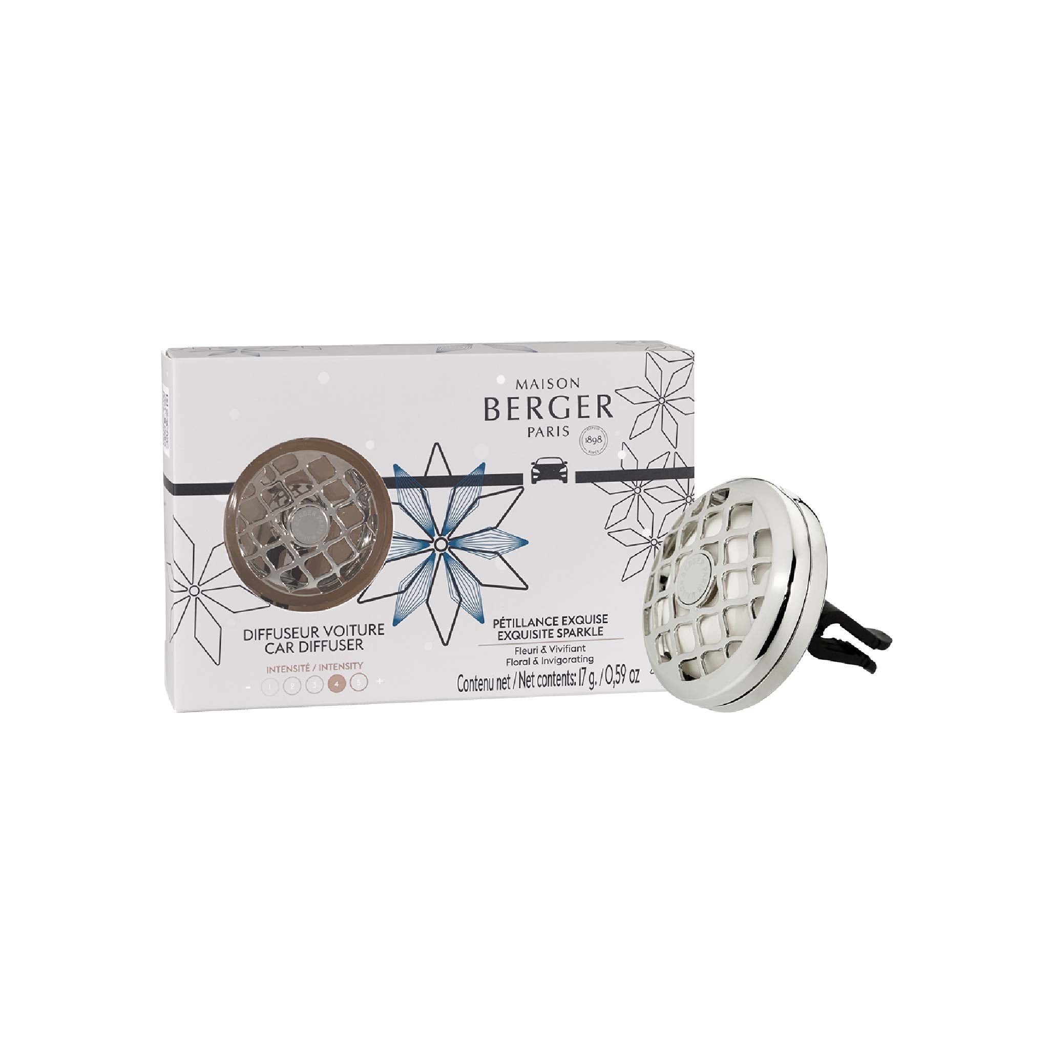 Maison Berger Paris’ car diffuser of the Rosalie Collection is crafted from sleek metal coloured silver. Featuring curious ornate cutouts and a clip on its reverse for no-fuss attachment, it comes complete with their classic Exquisite Sparkle fragrance - marvel as grapefruit blends with patchouli and rose, then violet and musk. Gift boxed and housed within a branded bag - Berger’s car diffuser is the go-to for olfactory obsessives on the go.