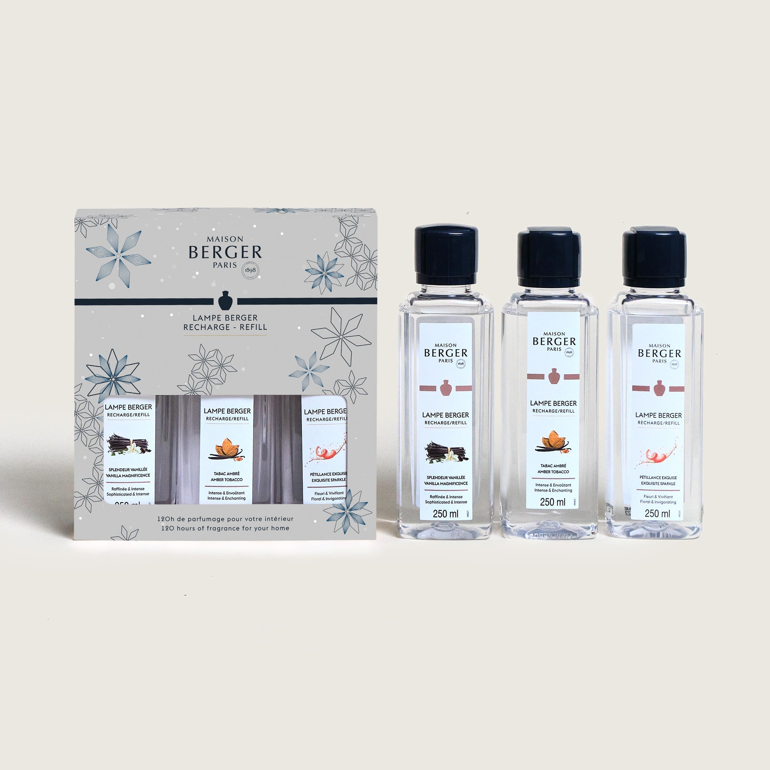 Maison Berger Paris’ fragrance lamp refill trio of the Rosalie Collection is the go-to for home scent lovers. Featuring their classic Amber Tobacco, Vanilla Magnificence and Exquisite Sparkle fragrances; each housed in a chic box and presented in a branded bag - all that’s missing is your favourite Berger lamp.