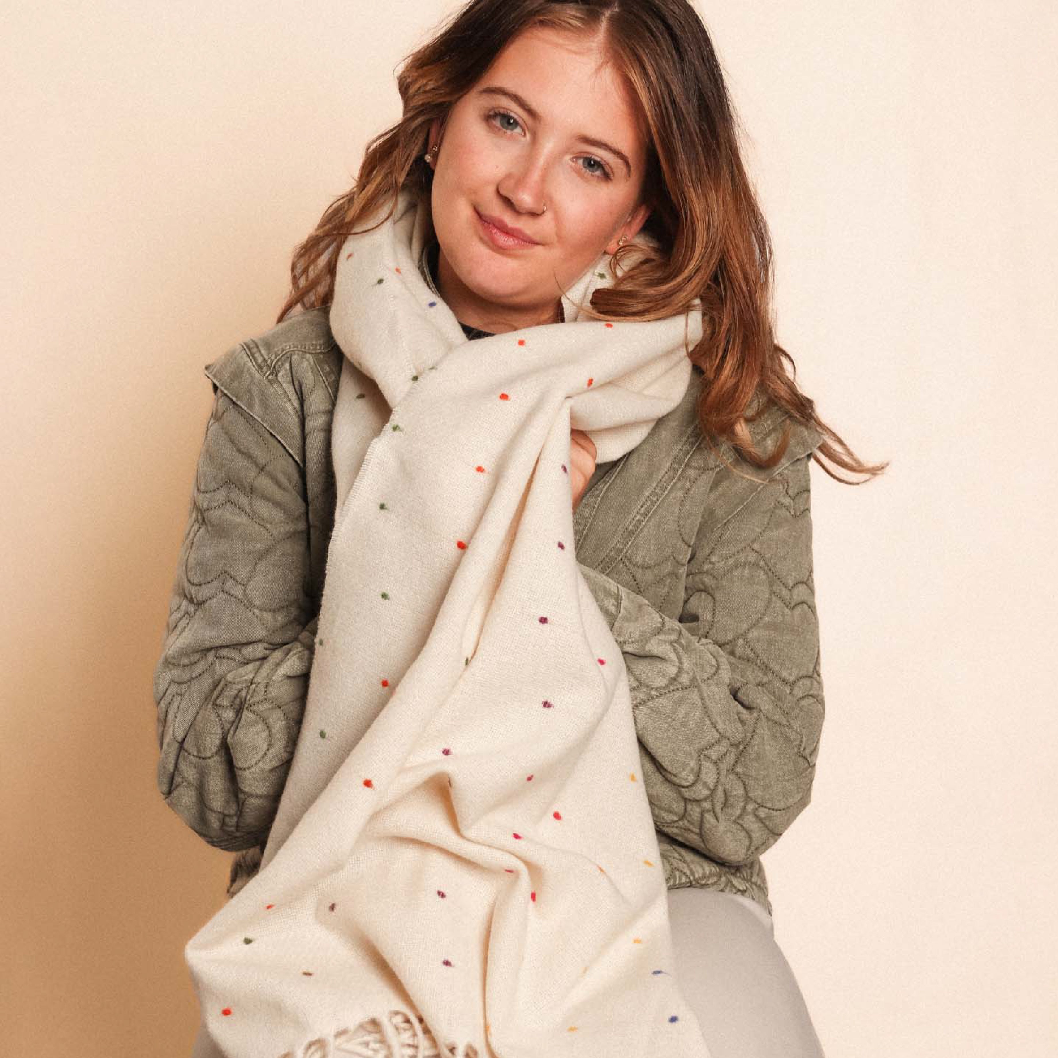 Zelly’s winter scarf defines indulgence. Crafted from plush viscose coloured cream, it features a modern dot motif in multicolour, and comes complete with classic tassels on each end. Whether sporting for morning runs or afternoon strolls - Zelly’s winter scarf is the go-to accessory come colder months.